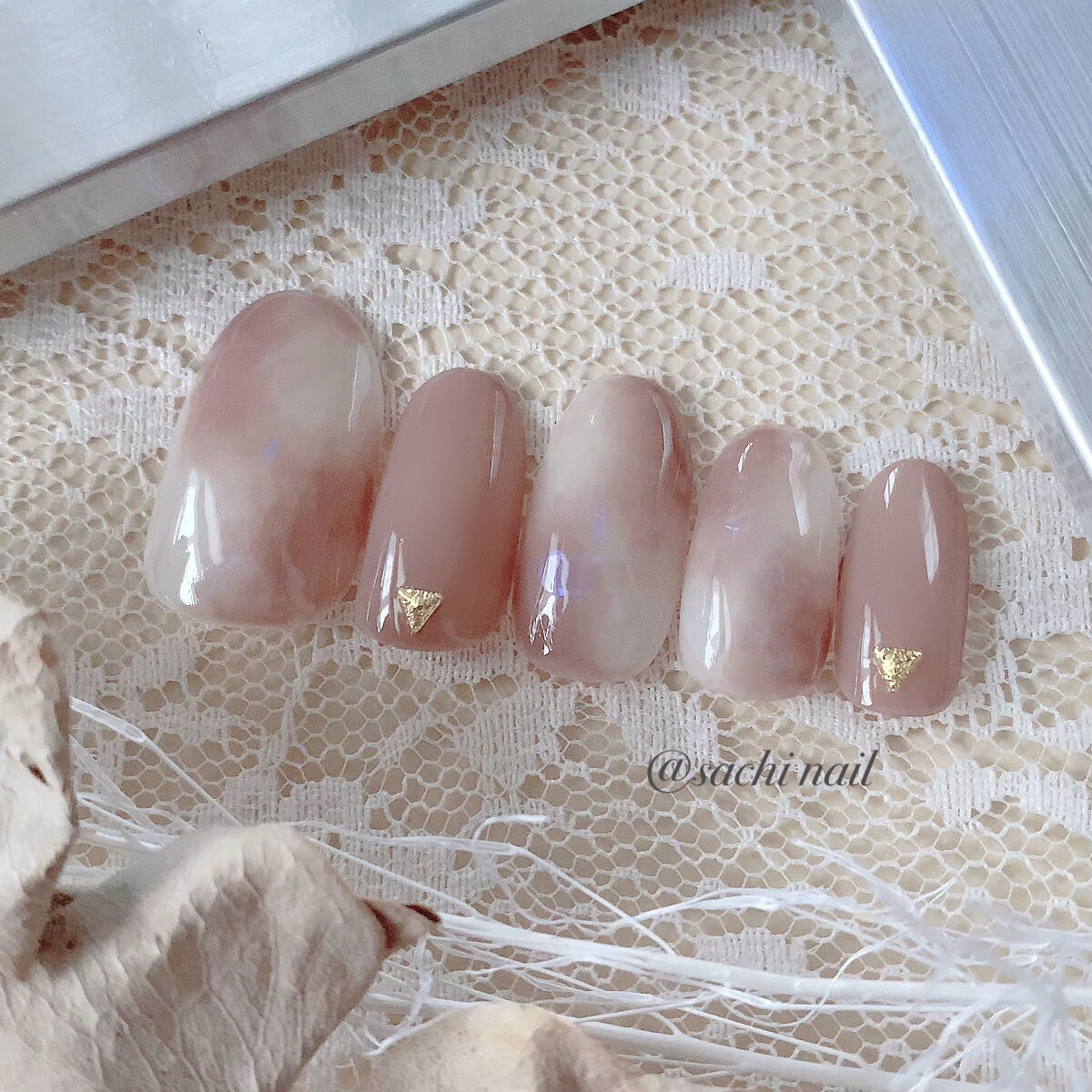 ワンカラーでも指ごとに色を変えるだけでオシャレに見えます💕 画像のようにゴールドラインとストーンを少し足すだけで華やかさがアップ🥰 何度かご紹介したことのあるスポンジで作るグラデーションです✨ スポンジを使うことで境目が綺麗に馴染んでくれます💕 アルミホイルの上でブラウンとトップコートを1:1くらいで混ぜたものを、トップコートのハケに取って3箇所に塗るだけ👌 事前に混ぜたものを塗ることで、爪の上でぼかすより簡単に出来ます💕 ベースカラーが乾く前に点置きしてぼかすことで綺麗にぼかせます✨ スピードが大事なので、使うポリッシュのキャップは全て開けておきましょう😊 天然石のラインはガタガタの方がより天然石っぽく見えるので、ラインを描くのが苦手な方でも大丈夫🙆♀️ 難しそうに見えて、やってみると意外と簡単に出来ます♡