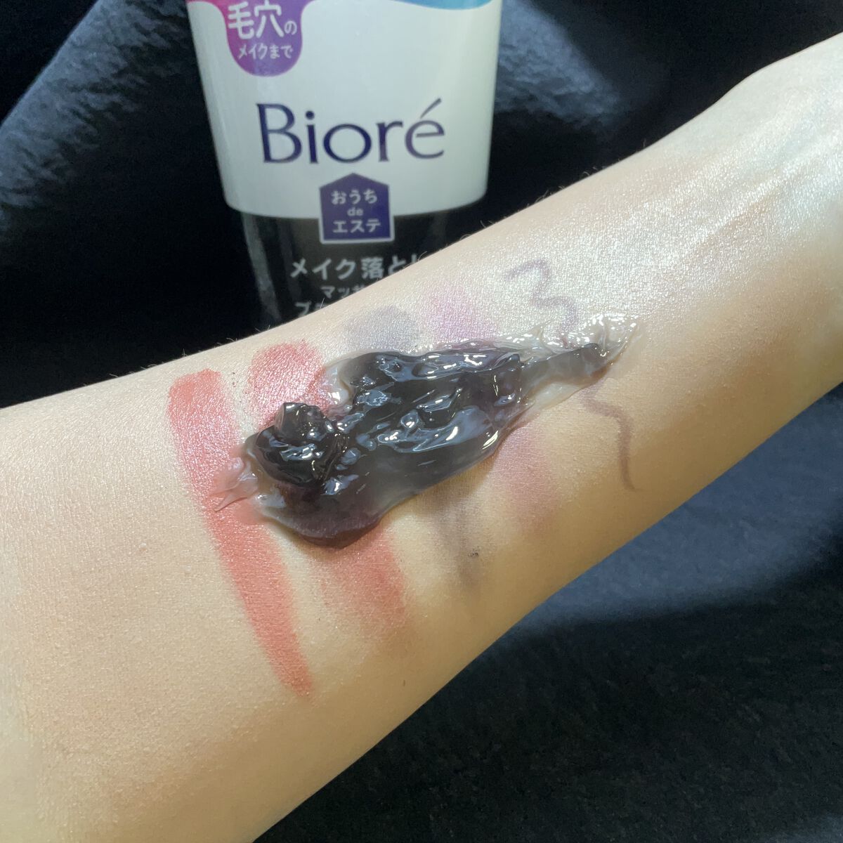 - 毛穴ケアに人気のおうちdeエステからメイク落としが発売! 炭(洗浄助剤)配合ディープクレンジング処方のブラックジェルで毛穴に入り込んだメイク汚れまでしっかり溶かし落とす! つっぱりにくく、しっとりつるりとした洗いあがり。 毎日のクレンジングがエステに変わる! ◆ウォータープルーフマスカラまで落とせます。 ◆摩擦低減*設計で肌なじみのいいやわらかいジェルタイプ ◆手や顔がぬれていても使えます。 ◆毛穴が開きやすいお風呂場での使用がおすすめです。 ◆すすぎ後の洗顔はいりません。 ◆気分リラックス フレッシュフローラルの香り *ビオレしっかりクリアジェルとの比較