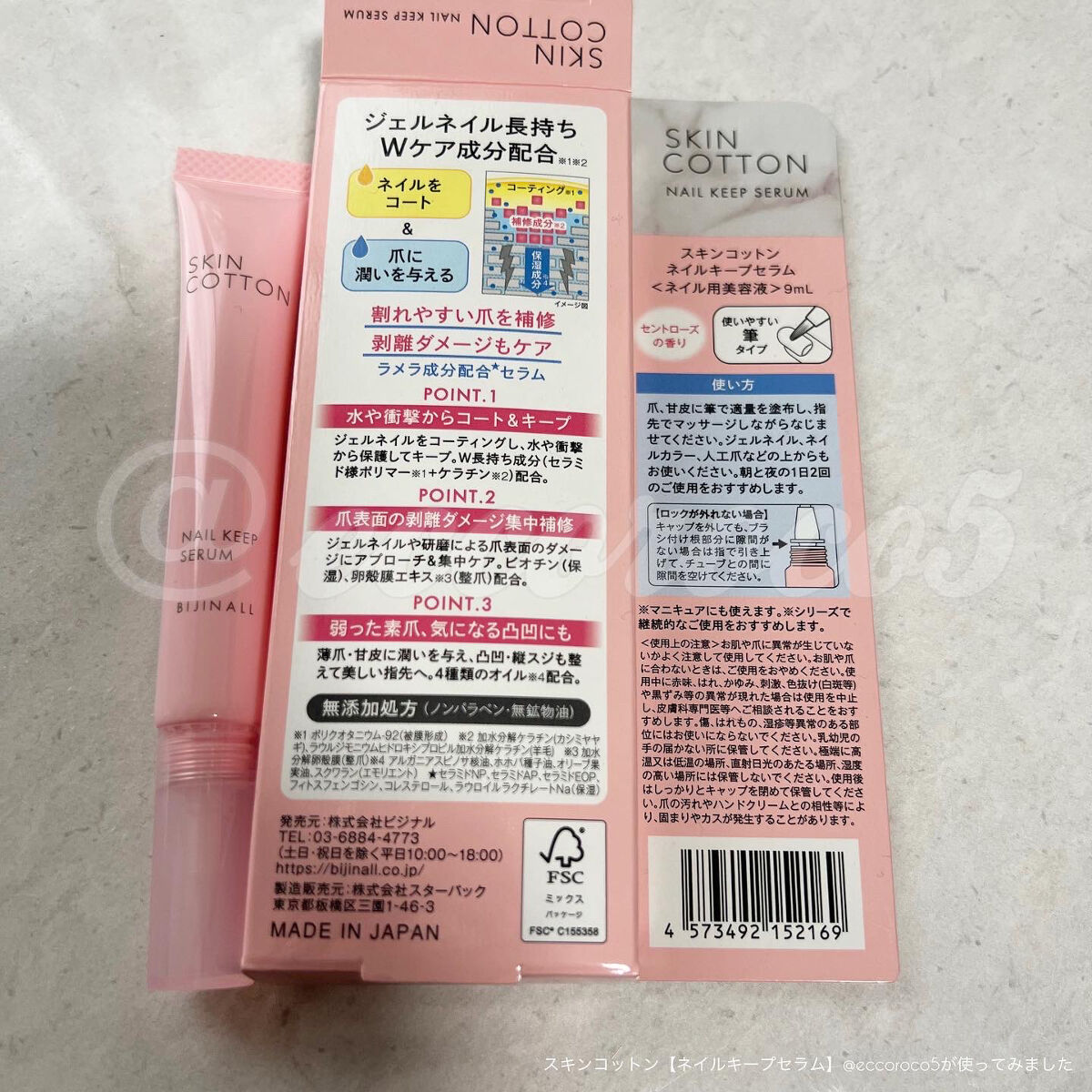 ジェルネイル2倍長持ちWケア成分配合のネイル用美容液だよ〜っ🌟ジェルネイルをコーティングし水や衝撃から保護して長持ちさせる💅 ジェルネイルの繰り返しや研磨による爪表面の剥離ダメージ集中補修に✨ビオチン、卵殻膜エキス(整爪)配合にアルガニアスピノサ核油、ホホバ種子油オリーブ果実油、スクワラン(保湿)配合で薄爪、甘皮に潤いを与え、凸凹、縦スジも整えて美しい指先へ👋 ジェルネイルの浮きや剥げの原因となる爪と爪周りの乾燥を防いでくれる🫧スキンコットン独自の浸透ラメラ処方🌈 爪、甘皮に筆で適量を塗布したら指先でマッサージしながらなじませる❣️朝と夜の1日2回の使用がおすすめらしい✨透明の液がでてくるよ🤍ベタベタしなくて馴染み良い!ネイルお休み中でも素爪のケアも出来るの良いっ😍🎈