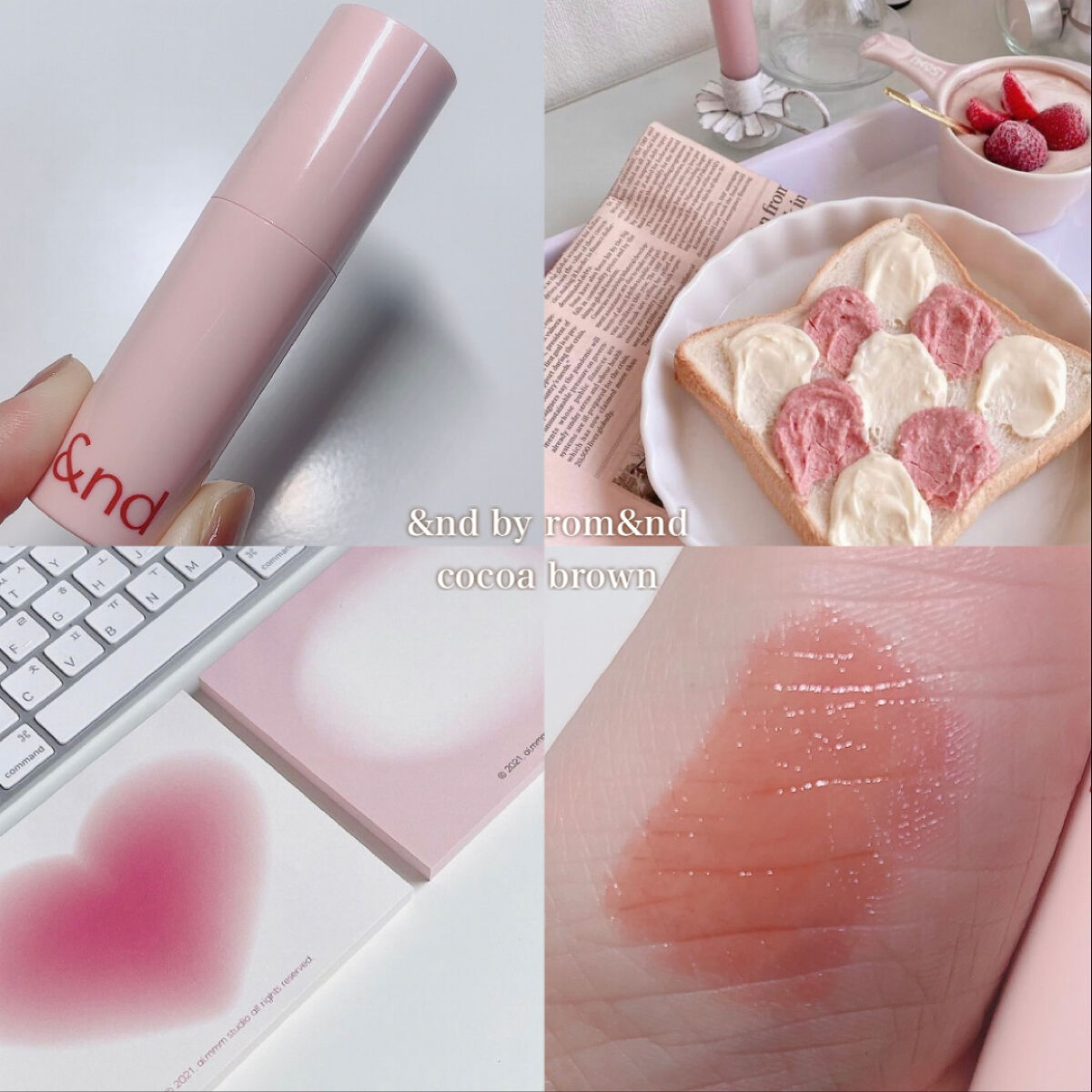 ローソン限定!ロムアンドコラボティント♡&ndbyrom&nd「アンドバイロムアンド グラッシーボムティント」 ¥820・BE01ヌーディーヌード・BR01デザートブリック・BR02ローズビーン・BR03ココアブラウン・VD01Milkyco...