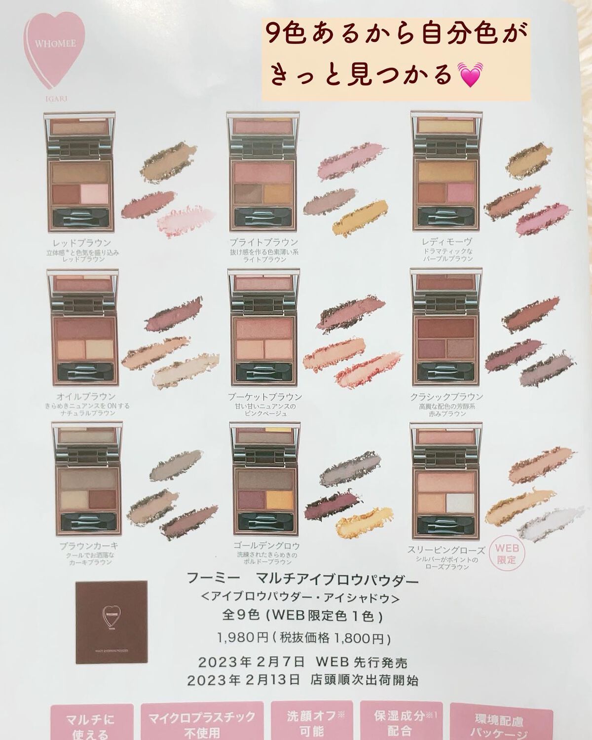 - WHOMEEアイブロウパウダーが 処方もパッケージも変わり大幅リニューアル。 お肌にも、環境にも配慮した新処方でアイブロウはもちろん、アイシャドウとしても使えるように。 【WEB発売】 2023年2月7日 AM10:00 公式オンラインショップ 【店頭発売】 2023年2月13日 以降全国のバラエティショップにて順次発売