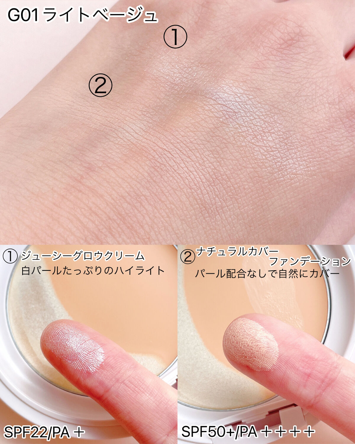 - ツヤとカバーの2種のベースが1つになった 2in1ツヤ肌パクト 繊細な白パールをたっぷり配合した上品なジューシーグロウクリームと パール無配合で肌悩みを自然にカバーするナチュラルカバーファンデーションの、2in1構造! ツヤを好きなだけ自由にのせて、自分好みのツヤ肌を叶えてください♡ 美容オイル配合で、まるでスキンケアしたてのようなちゅるちゅるお肌が続きます。
