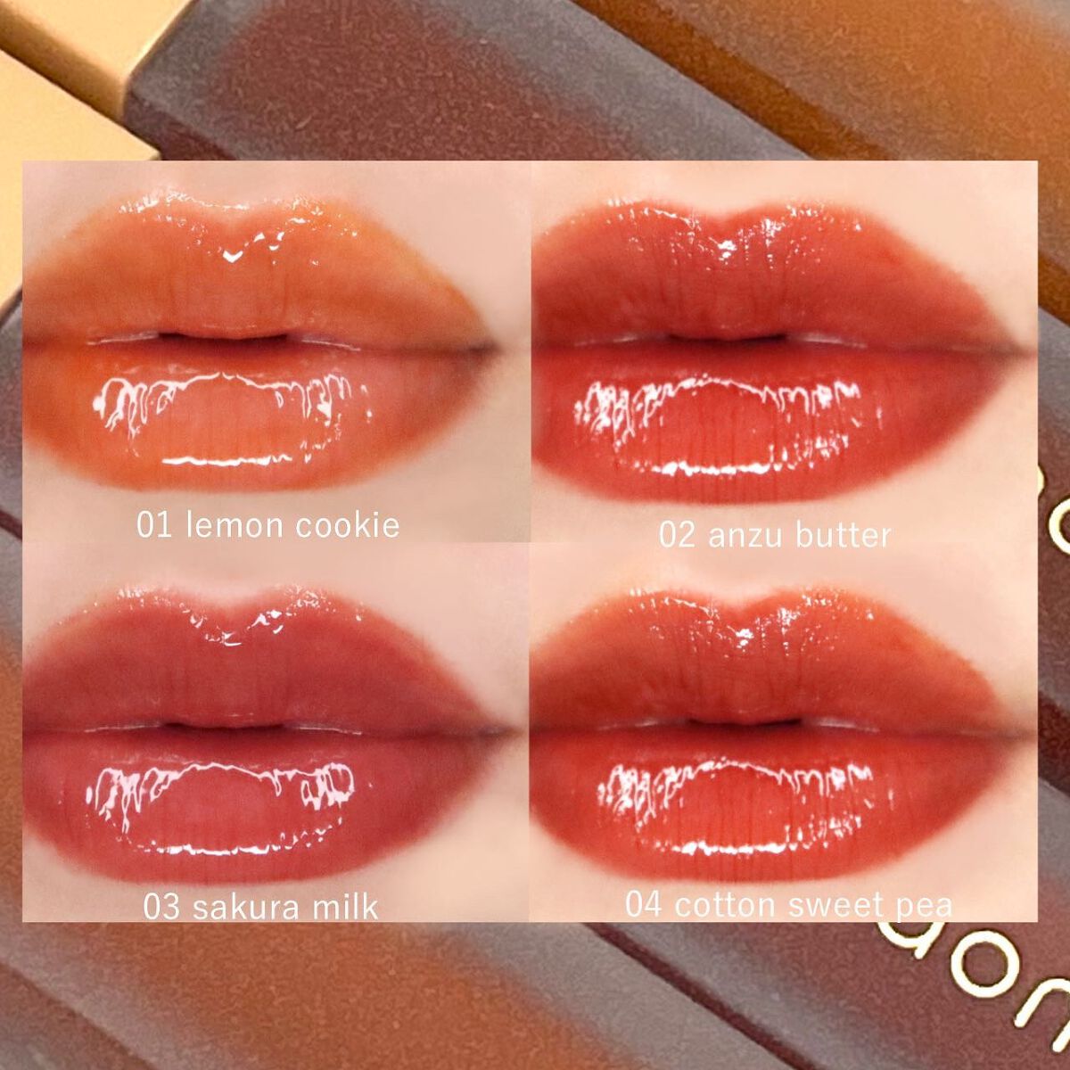 - <01 れもんクッキー> ジフェニルジメチコン、水、リンゴ酸ジイソステアリル、ビスジグリセリルポリアシルアジペート-2、オクチルドデカノール、水添ポリイソブテン、ダイマージリノール酸ダイマージリノレイルビス(ベヘニル/イソステアリル/フィトステリル)、ジグリセリン、DPG、セチルPEG/PPG-10/1ジメチコン、イソステアリン酸ソルビタン、ポリソルベート60、スクワラン、アーモンド油、オリーブ果実油、アルガニアスピノサ核油、カニナバラ果実エキス、トリ(カプリル酸/カプリン酸)グリセリル、グリセリン、ステビオシド、(アクリル酸ヒドロキシエチル/アクリロイルジメチルタウリンNa)コポリマー、ポリグリセリン-3、ペンチレングリコール、エチルヘキシルグリセリン、セテアレス-20、テトラ(ジ-t-ブチルヒドロキシヒドロケイヒ酸)ペンタエリスリチル、フェノキシエタノール、香料、酸化チタン、酸化鉄、赤227、黄4、黄5 <02 あんずバター> ジフェニルジメチコン、水、リンゴ酸ジイソステアリル、ビスジグリセリルポリアシルアジペート-2、オクチルドデカノール、水添ポリイソブテン、ダイマージリノール酸ダイマージリノレイルビス(ベヘニル/イソステアリル/フィトステリル)、ジグリセリン、DPG、セチルPEG/PPG-10/1ジメチコン、イソステアリン酸ソルビタン、ポリソルベート60、スクワラン、アーモンド油、オリーブ果実油、アルガニアスピノサ核油、カニナバラ果実エキス、トリ(カプリル酸/カプリン酸)グリセリル、グリセリン、ステビオシド、(アクリル酸ヒドロキシエチル/アクリロイルジメチルタウリンNa)コポリマー、ポリグリセリン-3、ペンチレングリコール、エチルヘキシルグリセリン、セテアレス-20、テトラ(ジ-t-ブチルヒドロキシヒドロケイヒ酸)ペンタエリスリチル、フェノキシエタノール、香料、酸化チタン、酸化鉄、赤227、黄4、黄5 <03 さくらミルク > ジフェニルジメチコン、水、リンゴ酸ジイソステアリル、ビスジグリセリルポリアシルアジペート-2、オクチルドデカノール、水添ポリイソブテン、ダイマージリノール酸ダイマージリノレイルビス(ベヘニル/イソステアリル/フィトステリル)、ジグリセリン、DPG、セチルPEG/PPG-10/1ジメチコン、イソステアリン酸ソルビタン、ポリソルベート60、スクワラン、アーモンド油、オリーブ果実油、アルガニアスピノサ核油、カニナバラ果実エキス、トリ(カプリル酸/カプリン酸)グリセリル、グリセリン、ステビオシド、(アクリル酸ヒドロキシエチル/アクリロイルジメチルタウリンNa)コポリマー、ポリグリセリン-3、ペンチレングリコール、エチルヘキシルグリセリン、セテアレス-20、テトラ(ジ-t-ブチルヒドロキシヒドロケイヒ酸)ペンタエリスリチル、フェノキシエタノール、香料、酸化チタン、赤227、黄4、青1 <04 コットンスイートピー > ジフェニルジメチコン、水、リンゴ酸ジイソステアリル、ビスジグリセリルポリアシルアジペート-2、オクチルドデカノール、水添ポリイソブテン、ダイマージリノール酸ダイマージリノレイルビス(ベヘニル/イソステアリル/フィトステリル)、ジグリセリン、DPG、セチルPEG/PPG-10/1ジメチコン、イソステアリン酸ソルビタン、ポリソルベート60、スクワラン、アーモンド油、オリーブ果実油、アルガニアスピノサ核油、カニナバラ果実エキス、トリ(カプリル酸/カプリン酸)グリセリル、グリセリン、ステビオシド、(アクリル酸ヒドロキシエチル/アクリロイルジメチルタウリンNa)コポリマー、ポリグリセリン-3、ペンチレングリコール、エチルヘキシルグリセリン、セテアレス-20、テトラ(ジ-t-ブチルヒドロキシヒドロケイヒ酸)ペンタエリスリチル、フェノキシエタノール、香料、酸化チタン、酸化鉄、赤104(1)、黄5、青1 <05 チョコレートコスモス> ジフェニルジメチコン、水、リンゴ酸ジイソステアリル、ビスジグリセリルポリアシルアジペート-2、オクチルドデカノール、水添ポリイソブテン、ダイマージリノール酸ダイマージリノレイルビス(ベヘニル/イソステアリル/フィトステリル)、ジグリセリン、DPG、セチルPEG/PPG-10/1ジメチコン、イソステアリン酸ソルビタン、ポリソルベート60、スクワラン、アーモンド油、オリーブ果実油、アルガニアスピノサ核油、カニナバラ果実エキス、トリ(カプリル酸/カプリン酸)グリセリル、グリセリン、ステビオシド、(アクリル酸ヒドロキシエチル/アクリロイルジメチルタウリンNa)コポリマー、ポリグリセリン-3、ペンチレングリコール、エチルヘキシルグリセリン、セテアレス-20、テトラ(ジ-t-ブチルヒドロキシヒドロケイヒ酸)ペンタエリスリチル、フェノキシエタノール、香料、酸化チタン、酸化鉄、赤227、黄4、黄5、青1 <06 ももゼリー> ジフェニルジメチコン、水、リンゴ酸ジイソステアリル、ビスジグリセリルポリアシルアジペート-2、オクチルドデカノール、水添ポリイソブテン、ダイマージリノール酸ダイマージリノレイルビス(ベヘニル/イソステアリル/フィトステリル)、ジグリセリン