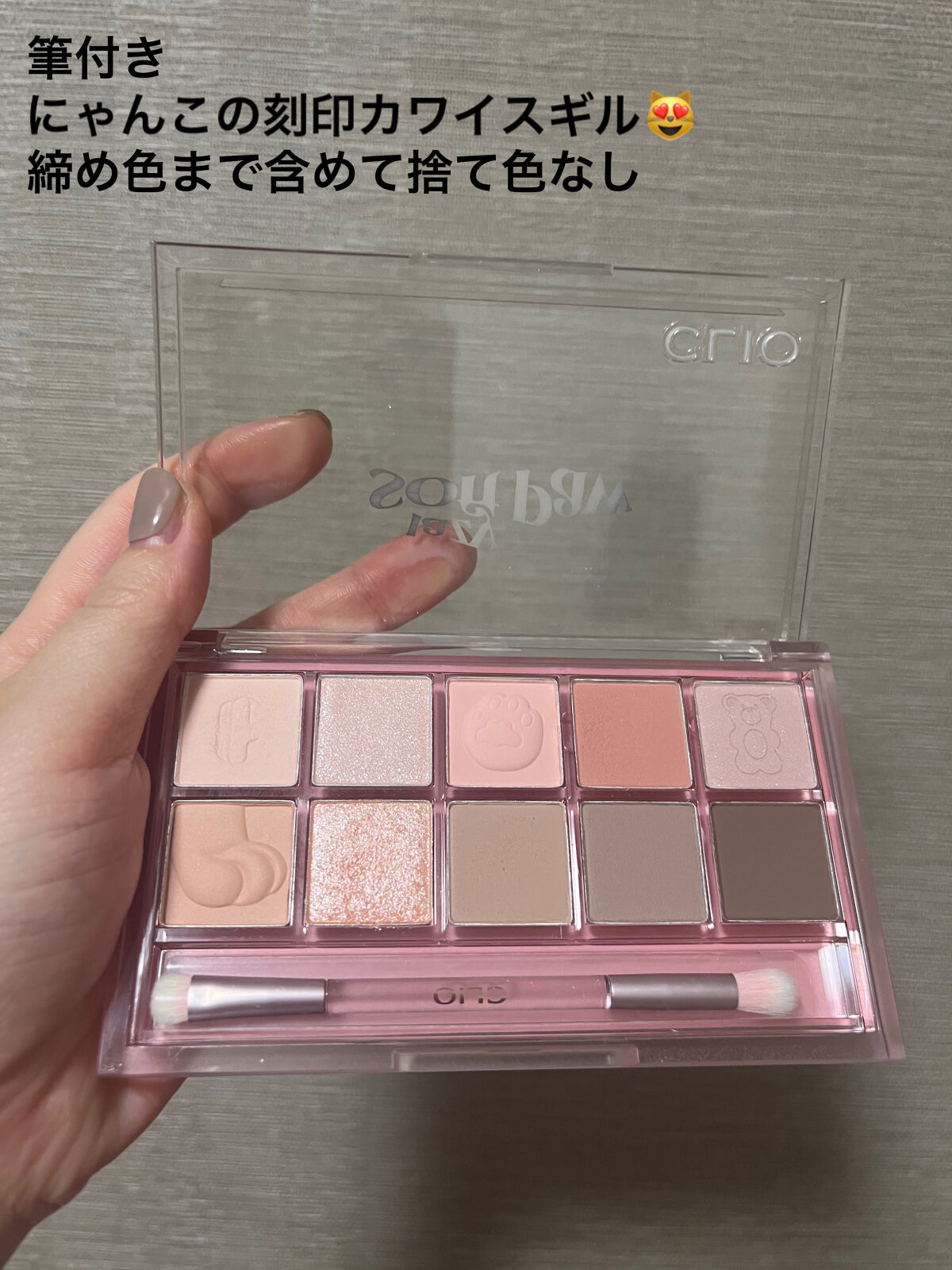かわいいチャーム付き ピンク&パープルパレット こちらは青みピンクとパープルで構成されたアイシャドウパレットです。 粉質もしっとりしていて 見たまま発色しますしラメも密着感があってよかったです。