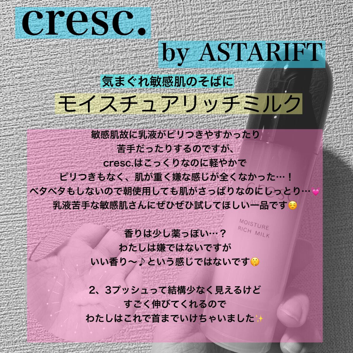 cresc.はアスタリフトの開発で培った知見を応用し、乾燥・敏感肌の根本原因に向き合う、2022.3に誕生したスキンケアブランドです。 いつもいいとは限らないのが人間。いいときも、うまくいかないときも、どんな時も一緒に、いい方向へという想いに共感できました。 季節や日々の変化で肌がゆらいでしまう原因は、肌のバリア機能の低下。肌バリアを整えて、うるおい満ちた ゆらぎにくい肌を目指しませんか? ジェリーコンディショナーはジェリー状なのに、なじませるとのびが良いです。ベタベタさは感じさせず、みずみずしさを感じられました。 モイスチュア リッチミルクはクリームと乳液の間のようなテクスチャー。コクがあるのに、なじませると、どんどんのびてくるのが不思議!ベタつきはなかなか感じにくく、サラッとしている感じがしました。