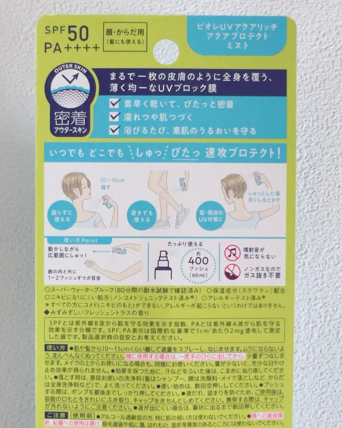 - 「しゅっ」→「ぴたっ」浴びる霧!?からのムラなく密着!いつでもどこでも速攻プロテクトで濡れつや肌続く!瞬感ミストUV。SPF50 PA++++、スーパーウォータープルーフ(80分間の耐水試験で確認済み)。顔・からだ用日やけ止め(髪にも使える)。素早くなじんで、白浮きしない。浴びるたび素肌のうるおい守る。スクワラン配合(保湿成分)。せっけんで落とせる。