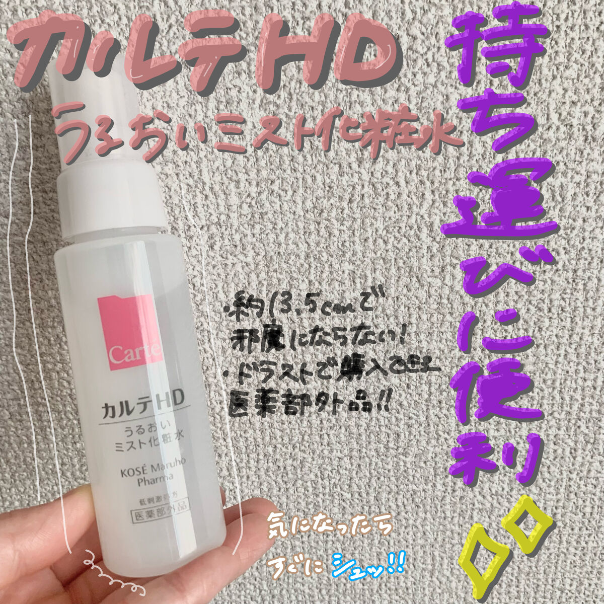 カルテHDは敏感肌向けで有名なKOSEのブランド! 医薬部外品・低刺激処方でゆらいでいるときも使いやすい商品♡ モイスチュア ミストローションはすっぴんの時はもちろん、メイクの上からも乾燥が気になる時に使っています。 ヘパリン類似物質HDがポイントで、肌の潤い構造【ラメラ構造】に働きかけてくれる保水有効成分✨