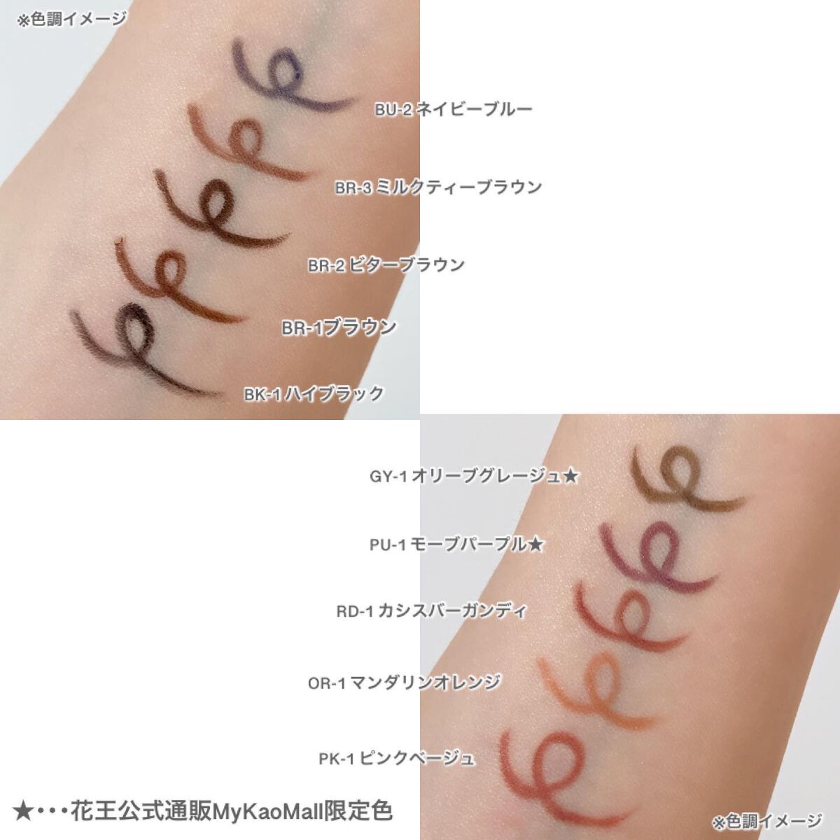 - <BR-5 ブリックブラウン> トリメチルシロキシケイ酸、イソドデカン、合成ワックス、トリ(カプリル酸/カプリン酸)グリセリル、合成フルオロフロゴパイト、カルナウバロウ、キャンデリラロウ炭化水素、ダイマージリノール酸ダイマージリノレイルビス(ベヘニル/イソステアリル/フィトステリル)、トコフェロール、ジメチコン、(+/-)グンジョウ、マイカ、酸化チタン、酸化鉄、水酸化Al <BR-6 モーブブラウン> トリメチルシロキシケイ酸、イソドデカン、合成ワックス、トリ(カプリル酸/カプリン酸)グリセリル、カルナウバロウ、キャンデリラロウ炭化水素、合成フルオロフロゴパイト、ダイマージリノール酸ダイマージリノレイルビス(ベヘニル/イソステアリル/フィトステリル)、トコフェロール、ジメチコン、(+/-)グンジョウ、マイカ、酸化チタン、酸化鉄、水酸化Al、赤202 <GY-3 ブラウングレージュ> トリメチルシロキシケイ酸、イソドデカン、合成ワックス、トリ(カプリル酸/カプリン酸)グリセリル、合成フルオロフロゴパイト、カルナウバロウ、キャンデリラロウ炭化水素、ダイマージリノール酸ダイマージリノレイルビス(ベヘニル/イソステアリル/フィトステリル)、トコフェロール、ジメチコン、(+/-)グンジョウ、マイカ、酸化チタン、酸化鉄、水酸化Al <GY-4 ディープグレージュ> トリメチルシロキシケイ酸、イソドデカン、合成ワックス、トリ(カプリル酸/カプリン酸)グリセリル、カルナウバロウ、キャンデリラロウ炭化水素、合成フルオロフロゴパイト、ダイマージリノール酸ダイマージリノレイルビス(ベヘニル/イソステアリル/フィトステリル)、トコフェロール、ジメチコン、(+/-)グンジョウ、マイカ、酸化チタン、酸化鉄、水酸化Al、赤202 <GY-5 アッシュグレージュ(限定)> トリメチルシロキシケイ酸、イソドデカン、合成ワックス、合成フルオロフロゴパイト、トリ(カプリル酸/カプリン酸)グリセリル、カルナウバロウ、キャンデリラロウ炭化水素、ダイマージリノール酸ダイマージリノレイルビス(ベヘニル/イソステアリル/フィトステリル)、トコフェロール、ジメチコン、(+/-)グンジョウ、マイカ、酸化チタン、酸化鉄、水酸化Al <OR-2 夕霧オレンジ(限定)> トリメチルシロキシケイ酸、イソドデカン、合成フルオロフロゴパイト、キャンデリラロウ炭化水素、カルナウバロウ、ジフェニルシロキシフェニルトリメチコン、合成ワックス、キャンデリラロウ、ペンタイソステアリン酸ジペンタエリスリチル、水添ポリイソブテン、トコフェロール、ジメチコン、(+/-)マイカ、酸化チタン、酸化鉄、水酸化Al、赤202 <PK-2 ピンクグレージュ(限定)> トリメチルシロキシケイ酸、イソドデカン、合成ワックス、合成フルオロフロゴパイト、トリ(カプリル酸/カプリン酸)グリセリル、カルナウバロウ、キャンデリラロウ炭化水素、ダイマージリノール酸ダイマージリノレイルビス(ベヘニル/イソステアリル/フィトステリル)、トコフェロール、ジメチコン、(+/-)グンジョウ、マイカ、酸化チタン、酸化鉄、水酸化Al <BR-4 濃霧ブラウン(限定)> トリメチルシロキシケイ酸、イソドデカン、合成フルオロフロゴパイト、キャンデリラロウ炭化水素、カルナウバロウ、ジフェニルシロキシフェニルトリメチコン、合成ワックス、キャンデリラロウ、ペンタイソステアリン酸ジペンタエリスリチル、水添ポリイソブテン、トコフェロール、ジメチコン、(+/-)マイカ、酸化チタン、酸化鉄、水酸化Al、赤202 <GY-2 雨雲グレージュ(限定)> トリメチルシロキシケイ酸、イソドデカン、合成フルオロフロゴパイト、キャンデリラロウ炭化水素、カルナウバロウ、ジフェニルシロキシフェニルトリメチコン、合成ワックス、キャンデリラロウ、ペンタイソステアリン酸ジペンタエリスリチル、水添ポリイソブテン、トコフェロール、ジメチコン、(+/-)マイカ、酸化チタン、酸化鉄、水酸化Al、赤202