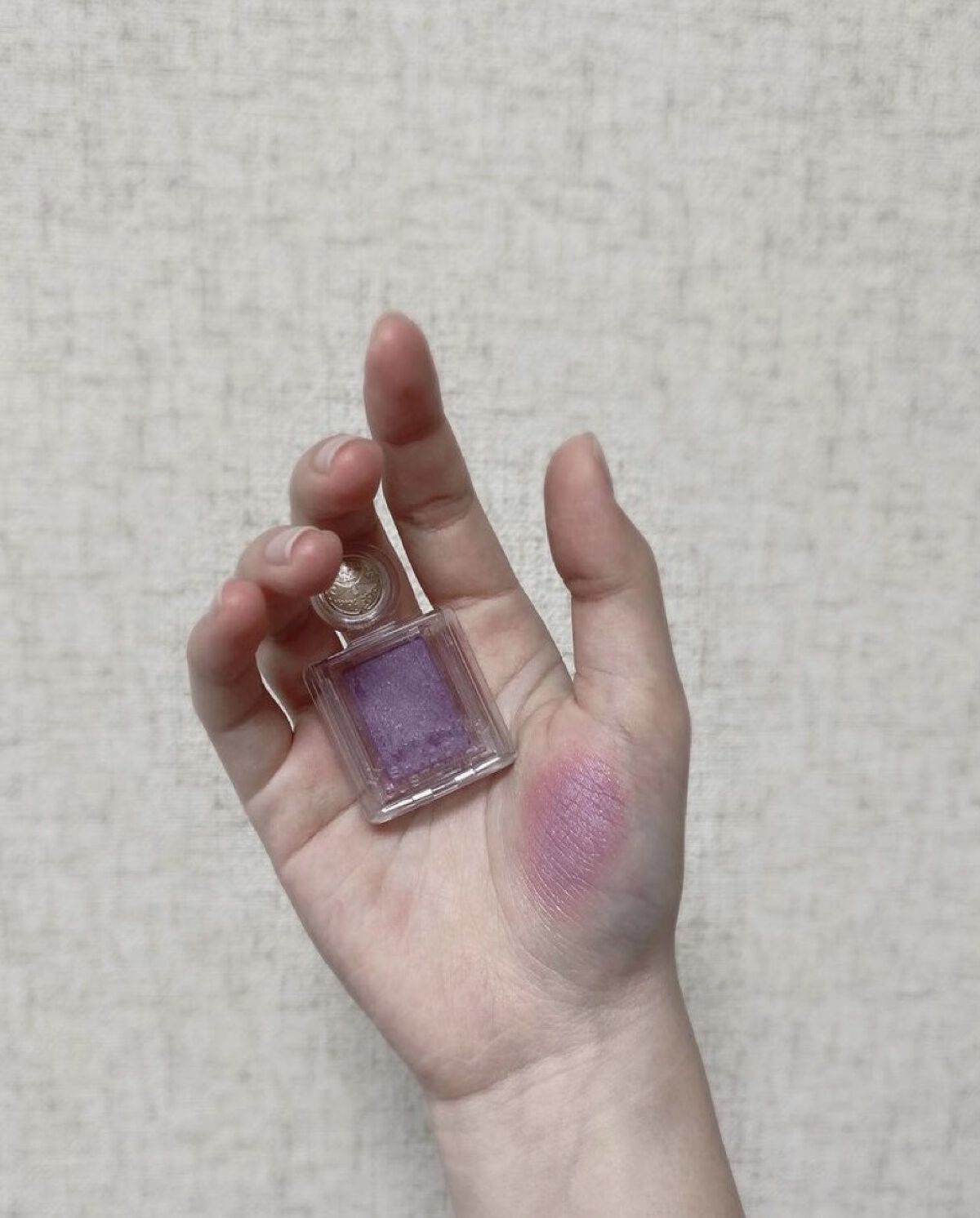 パウダーなのにみずみずしい♥ 全体的に濡れた様な艶が綺麗なアイシャドウで、屋内で見ても屋外で見ても最高にラメが綺麗。 左のカラーは白を多く混ぜたラベンダーカラーで、ベースカラーにぴったりな色。ラメがぱっと瞼を明るくしてくれる。 中央のカラーは、発色そのものは左のカラーと大差無いが、ラメの多さが違いこちらの方がよりぎっしり。多色ラメが宝石の様に散りばめられていて、ラメ好きにはたまらない。 右のカラーは深みの感じるパープルブラウン。締め色カラーだが私は二重幅ぐらいまでがっつりぬるのが目元に奥行きとかっこよさが出て好き。 どのカラーも自然に目を大きく見せてくれる。グラデーションもしやすく、また3色というのも捨て色が無いので非常に使いやすい。 粉はパサパサしてはいないが少しラメ飛びはするかもしれない。 ただ、こういった青みが強いかつ、普段使いしやすいアイシャドウパレットはなかなか無いのでありがたい。 きらめく艶が綺麗なので、別のカラーの購入の方も検討したい。
