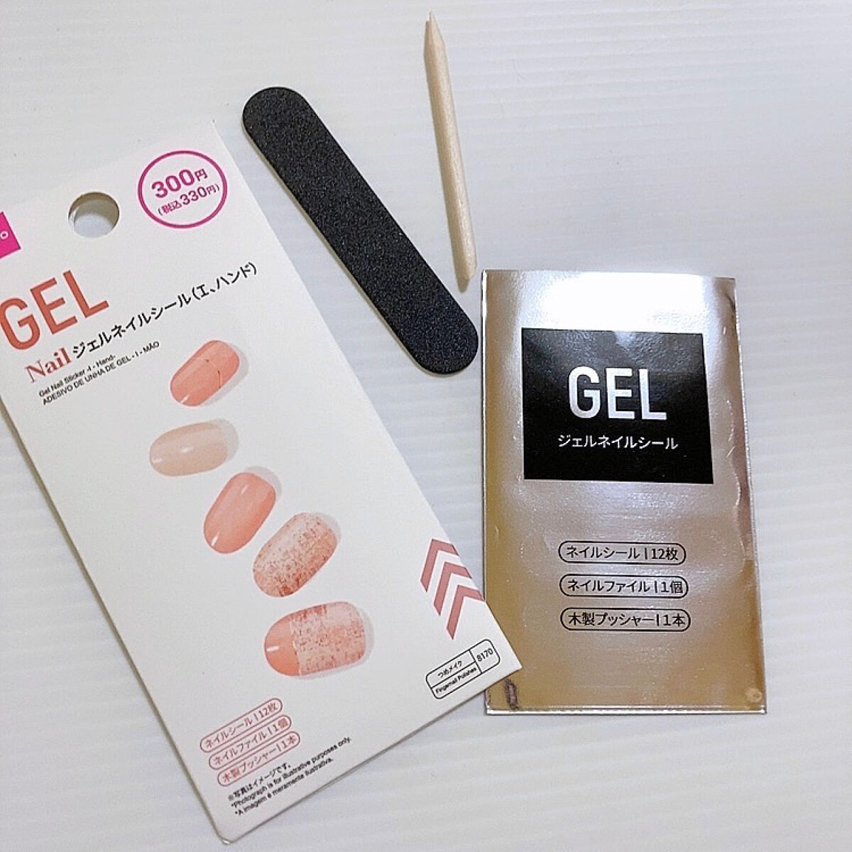 - 貼る、削る、硬化で簡単ジェルネイル セット内容 ネイルシール 12枚 ネイルファイル 1個 木製プッシャー 1本
