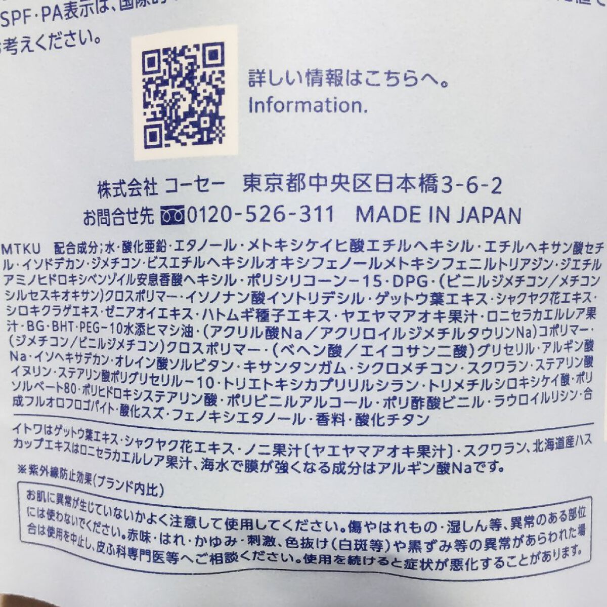 - <70g> マイカ、シリカ、酸化亜鉛、水、BG、ジメチコン、キサンタンガム、フェノキシエタノール、タルク、スクワラン、香料、トコフェロール、エタノール、サリチル酸エチルヘキシル、ポリヒドロキシステアリン酸、トリエトキシカプリリルシラン、DPG、イソドデカン、合成フルオロフロゴパイト、水酸化Na、ポリソルベート60、(アクリル酸ヒドロキシエチル/アクリロイルジメチルタウリンNa)コポリマー、トウキ根エキス、ビスエチルヘキシルオキシフェノールメトキシフェニルトリアジン、アイ葉/茎エキス、ハトムギ種子エキス、イソステアリン酸ソルビタン、コハク酸ジエチルヘキシル、イソヘキサデカン、ステアリン酸イヌリン、安息香酸アルキル(C12-15)、ボタンエキス、PEG-10水添ヒマシ油、ジエチルアミノヒドロキシベンゾイル安息香酸ヘキシル、テンニンカ果実エキス、サッカロミセス/ハトムギ種子発酵液、メロスリア根エキス、メチルトリメチコン、(アクリレーツ/メタクリル酸ベヘネス-25)コポリマー、ポリシリコーン-15、セバシン酸ジイソプロピル、ジ(カプリル酸/カプリン酸)PG、ハトムギ種子水