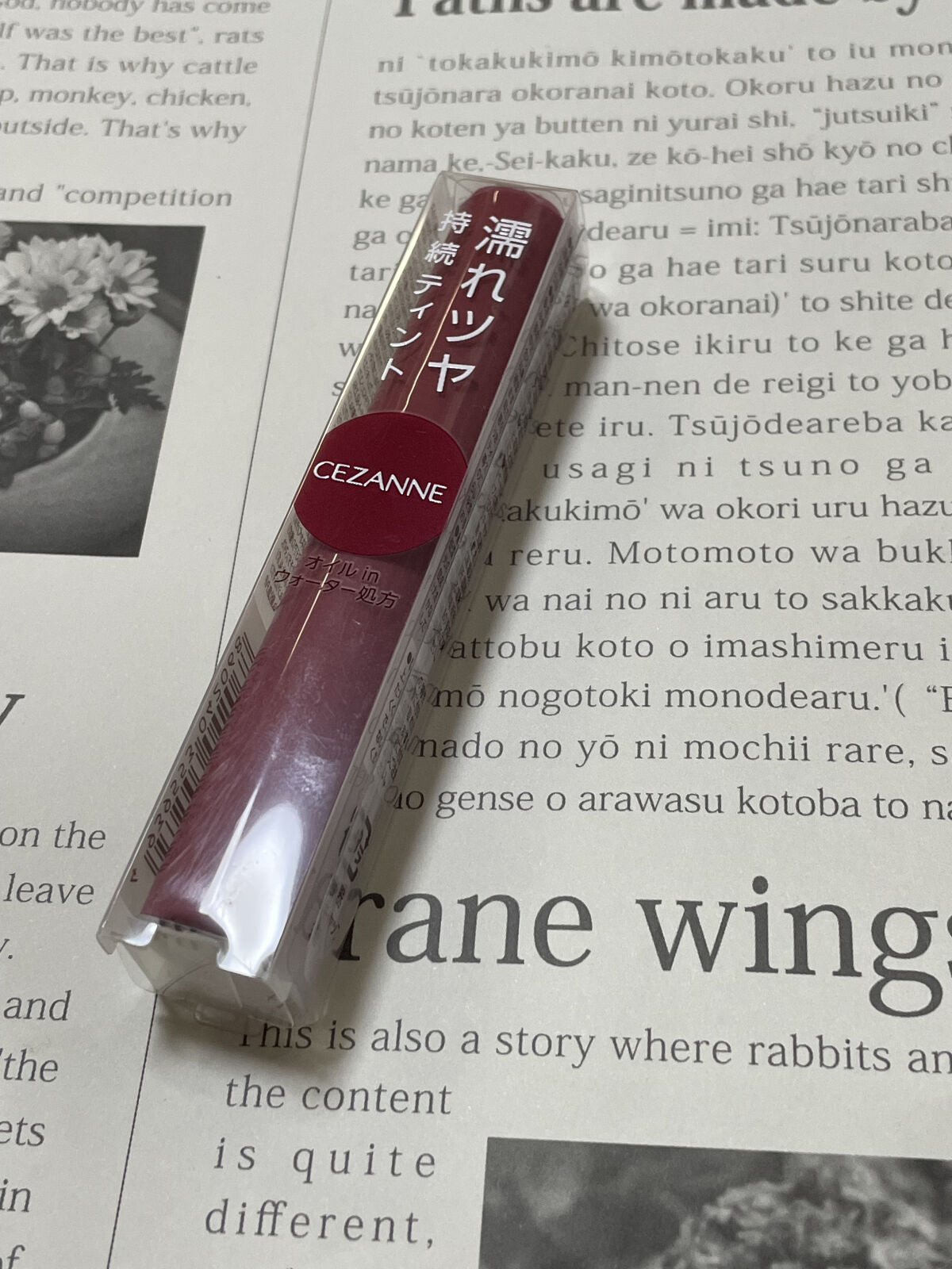 - ツヤ×色×潤いをキープする、セザンヌの新濡れツヤリップ みずみずしい濡れツヤ感ある仕上がりで、発色とツヤが長続きするティントリップです。ティントの発色を透明のベールで覆うリップコートのような処方で、ツヤ感と色をキープします。さらに、唇表面のべたつきは少なく、しっとり潤うオイルinウォーター処方を採用しています。