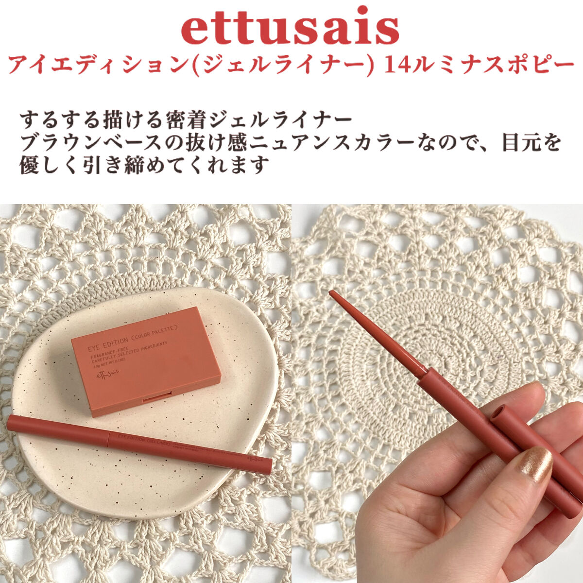 ettusaisのアイエディション カラーパレット21アプリコットチュールはPC問わず使えるコーラルベージュシャドウ×多色パール入りのパープルシャドウのパレット🫶 ラスティング ジェルライナー18アプリコットブラウンはアプリコットカラーな春色ブラウンライナー🌸 温かみのある使いやすいカラーだよ✨️