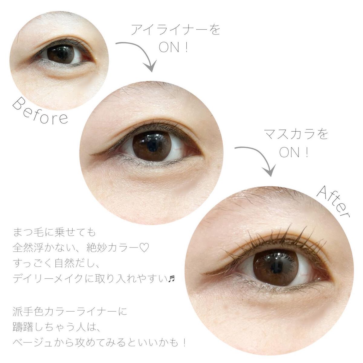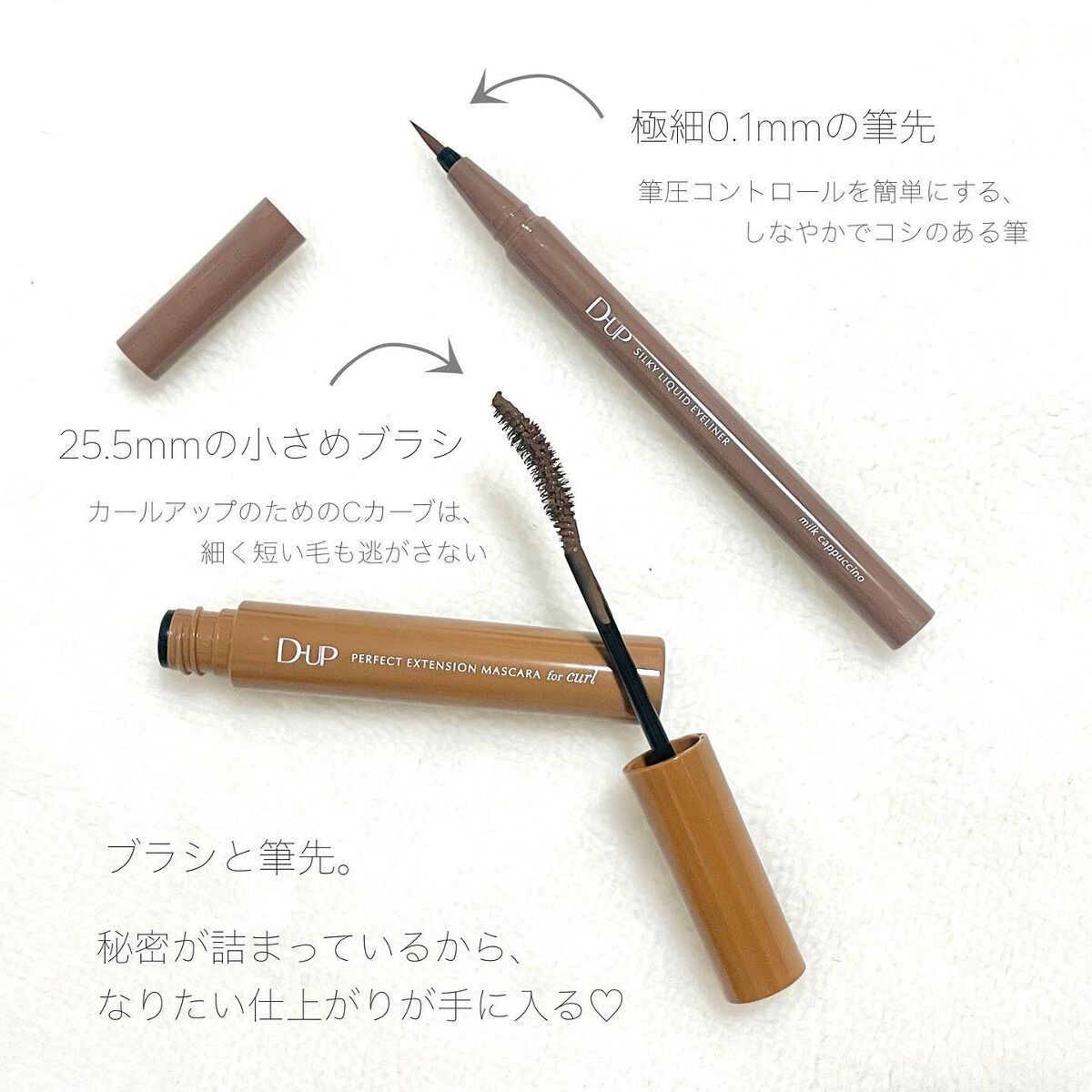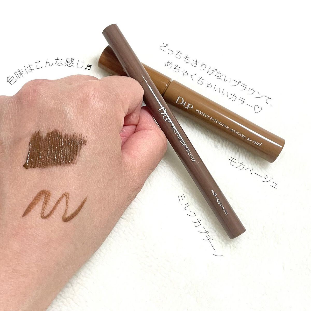 パーフェクトエクステンションマスカラ for カール マスカラ新色 『モカベージュ』 小さめブラシで小回り◎+カールブラシが目のカーブにフィットして塗りやすい🥰 シルキーリキッドアイライナー アイライナー新色 『ミルクカプチーノ』 目尻までかすれず滑らかに理想のラインが描けて、長時間キープ😘 王道ブラウンよりも、柔らかな存在感 やわらかい雰囲気を作りたいときはこれ😍