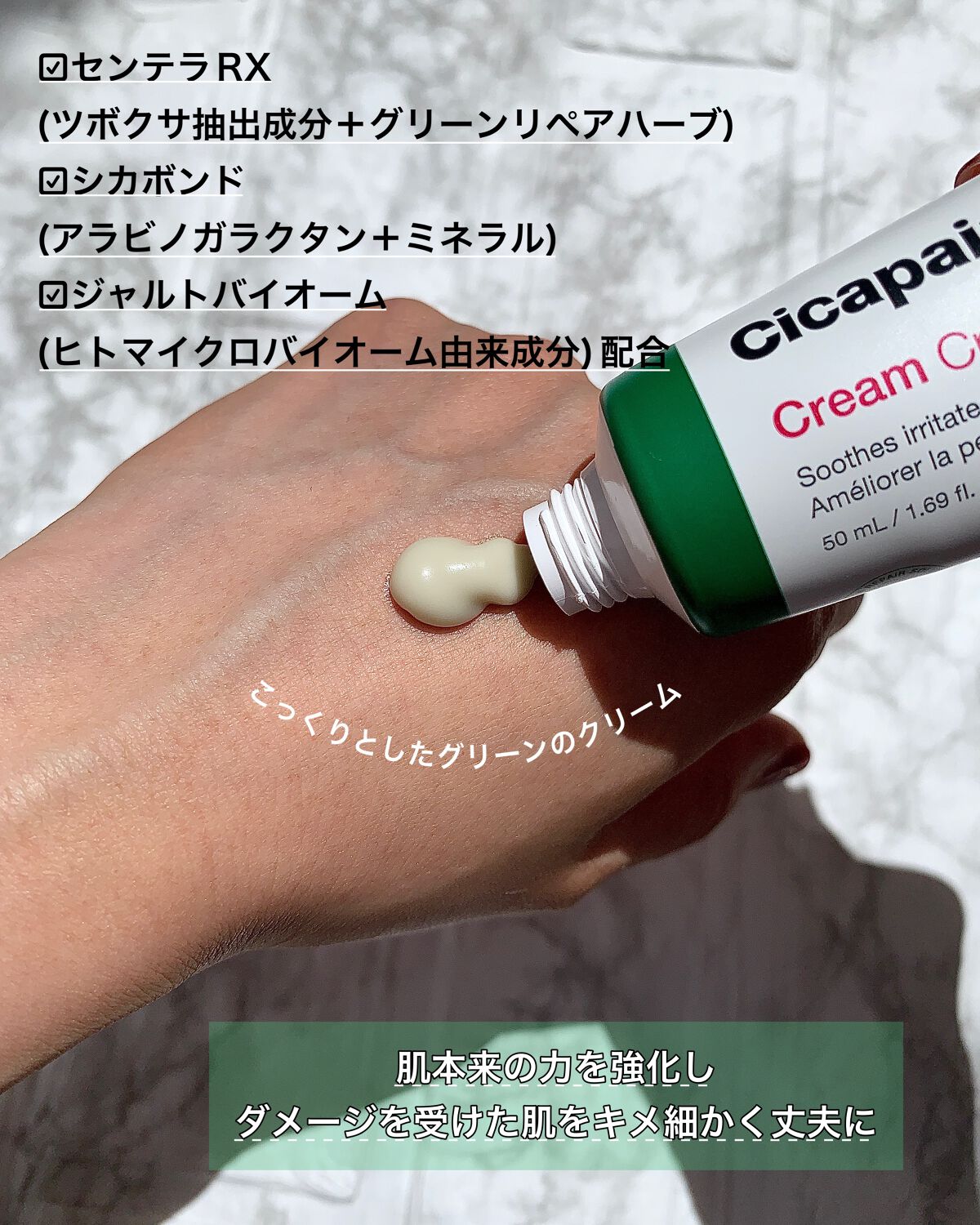 - 刺激で敏感になった肌をケアするツボクサ*配合のクリーム。密着感のあるテクスチャーで肌を保護し、健やかな肌を保ちます。(*ツボクサエキス:保湿)