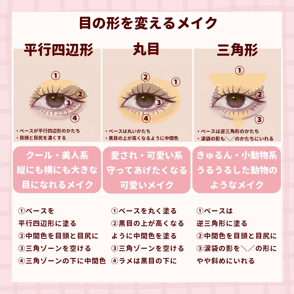 ・涙袋の影の部分まで、ベースを塗ることで縦幅がかなり強調されて丸目にみえる! ・アイシャドウの陰影とラメのハイライト効果で奥まった目に光を取り込んで出目っぽくみせる! ・淡いピンクのアイシャドウ、艶のようなラメ、細くて短いブラックアイラインが特徴 ・つり目を自然にいかせて、美人な雰囲気になれる! ・単色メイクは簡単そうに見えて難しいけど、ブラシを使うと綺麗なグラデーションになる! ・目の形によって中間色をどこまで入れるか変わるけど「目を開けた時に5mm見える」を基準にする
