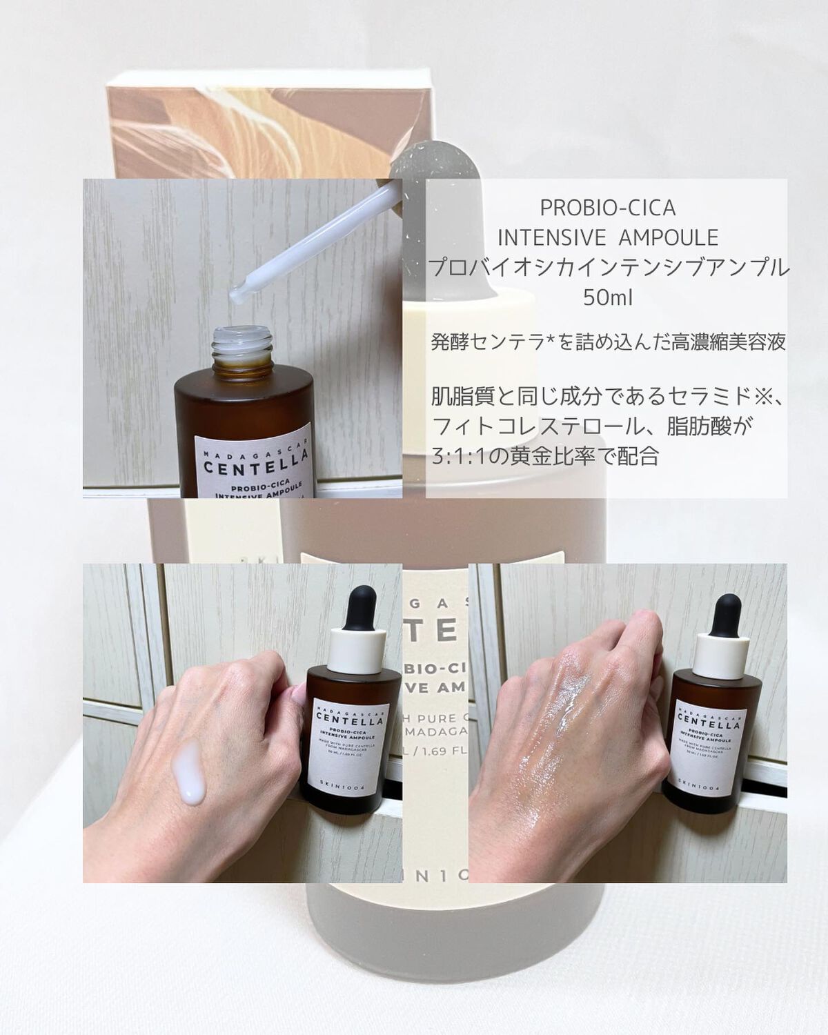PROBIO-CICAINTENSIVEAMPOULE⋆発酵センテラ(ツボクサエキス)と肌と同じ構造のシカセラミドを融合させ肌の吸収力を高め、ダメージを受けた肌のバリアケア・セラミド、フィトコレステロール、脂肪酸が肌のバリアをケアする3:1:...