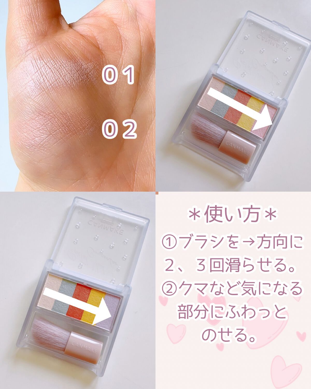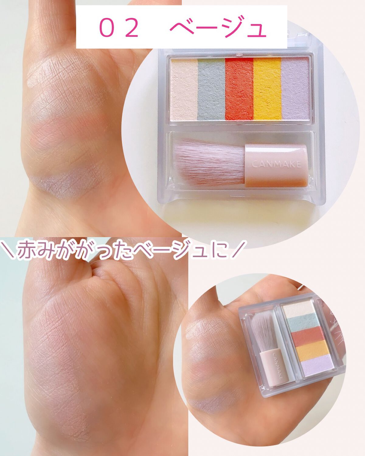 キャンメイク パステルヴェールコンシーラー02 ベージュめるで素肌クマ、頬パウダーコンシーラーカラーでふわっとぼかす混ぜるとベージュベースメイクの最後に使用します。左から順番に2〜3回ブラシを滑らせる。クマや頬の上にふわっと重ねる悩みによって...
