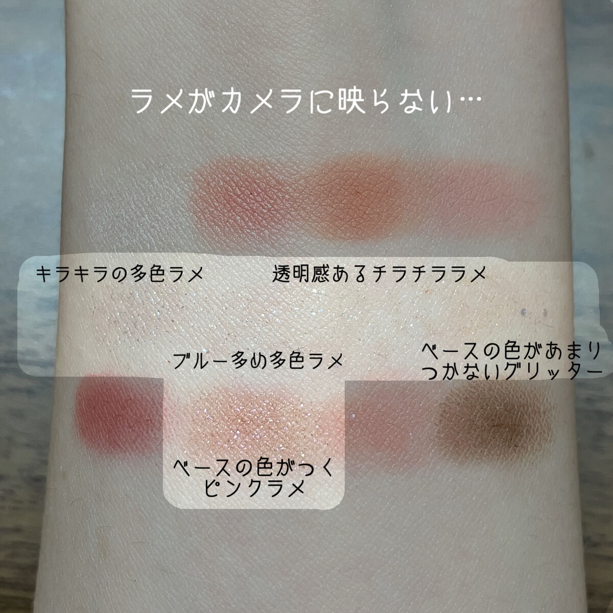発色が良いのが好き!! ラメも、しっかりキラキラしてくれてでも、品もあり見た目よりかなり使いやすい♫ 涙袋までコレでいけちゃうしこの、濃さか好きだし〜で、お気に入りのアイシャドウです♥️ 強いて言えば、パケが大きいのでポーチにはちょいと入れにくいくらいかな!