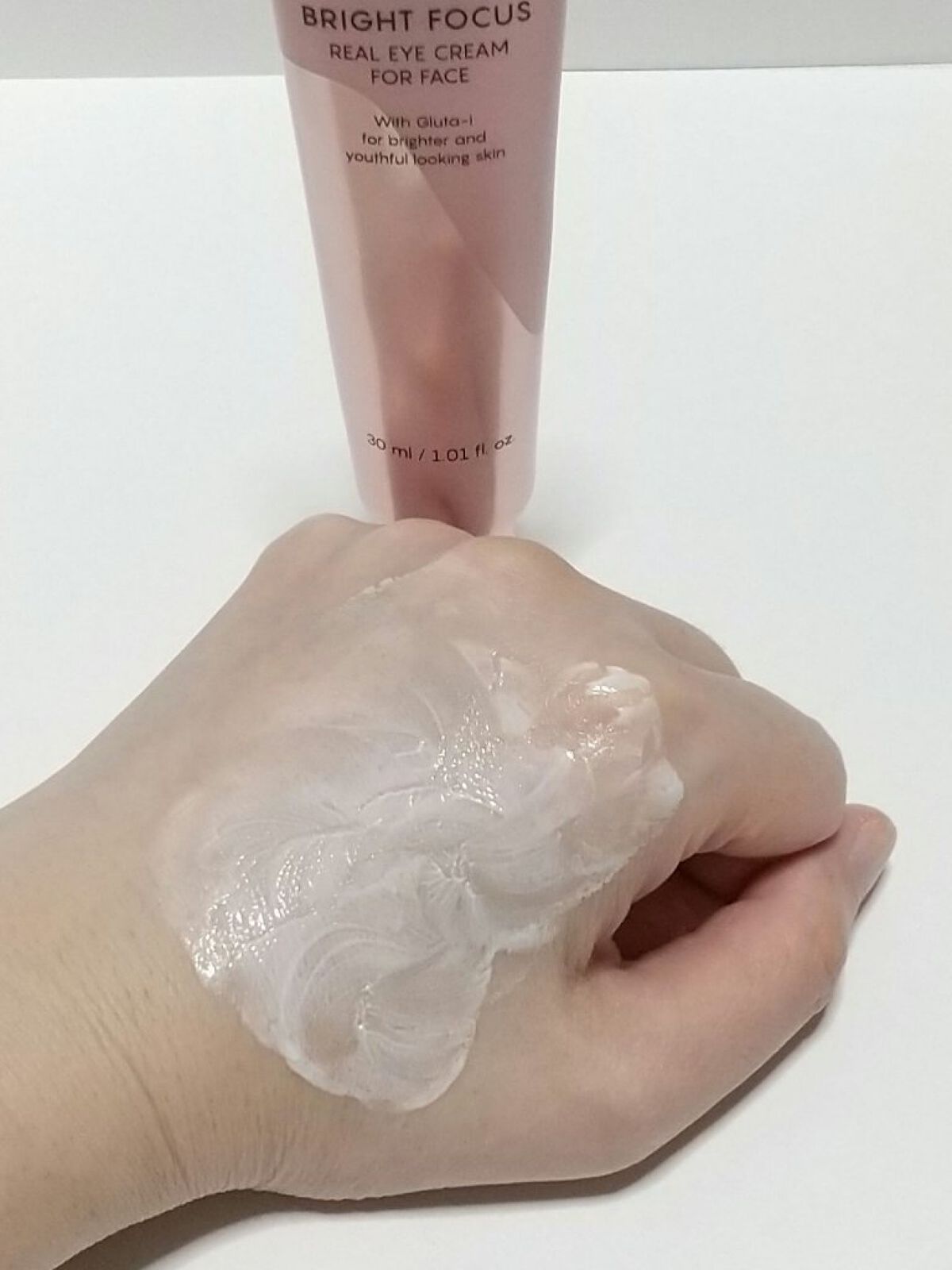 肌にうるおいを与え、明るい肌印象へ。肌をなめらかにし、なじませた直後からツヤのあるお肌へ導いてくれるそう。 目元だけでなく顔全体にも使えるとのこと。 こちらはそれよりもこってりとした印象ですが、なめらかに塗れてベタつかず、アイクリームの独特のペタペタ感がなくて使いやすく感じました。