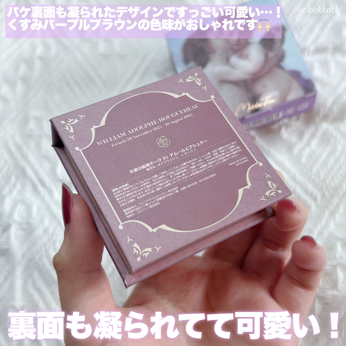 本物の絵画をモチーフにしたコスメで、イラストのタッチが細かくなめらか🫧 MilleFée特有のお上品で美学を刺激するような絵画コスメ🖼️ 他にもアイシャドウやマルチパレット等もあります🎨 まさにパケの天使ちゃんのようなマットで柔らかな粉質が大好きです💕