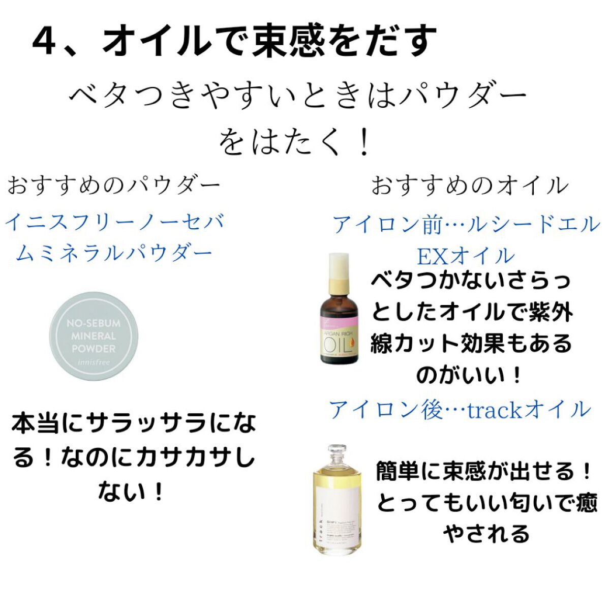 前髪が重めで垢抜けない気がする人はシースルーにするのをおすすめします! 重めぱっつん前髪は目力がでて可愛らしい感じになりますが重すぎると芋っぽくなりやすいので気をつけましょう! 前髪が真っ二つにわかれている人はわかれているところを水で濡らしてくしでまっすぐにとかしてからドライヤーを左右にふって乾かすとまっすぐになります! 前髪をまくときは一気に巻かずに上下で2回に分けてから真ん中からサイドの順に巻いていきましょう! 巻くときは外側に手をスライドさせて巻きましょう! 束感をだすと、垢抜けた印象になるのでオイルを塗るのがおすすめです! 巻いたあとはトラックオイルを軽くつけてあげるのがおすすめです! おでこのほうがベタついていると崩れやすいのでパウダーをはたくといいです! キラキラシューを毛先の方につけると艶のあるキラキラした前髪になるのでおすすめです!