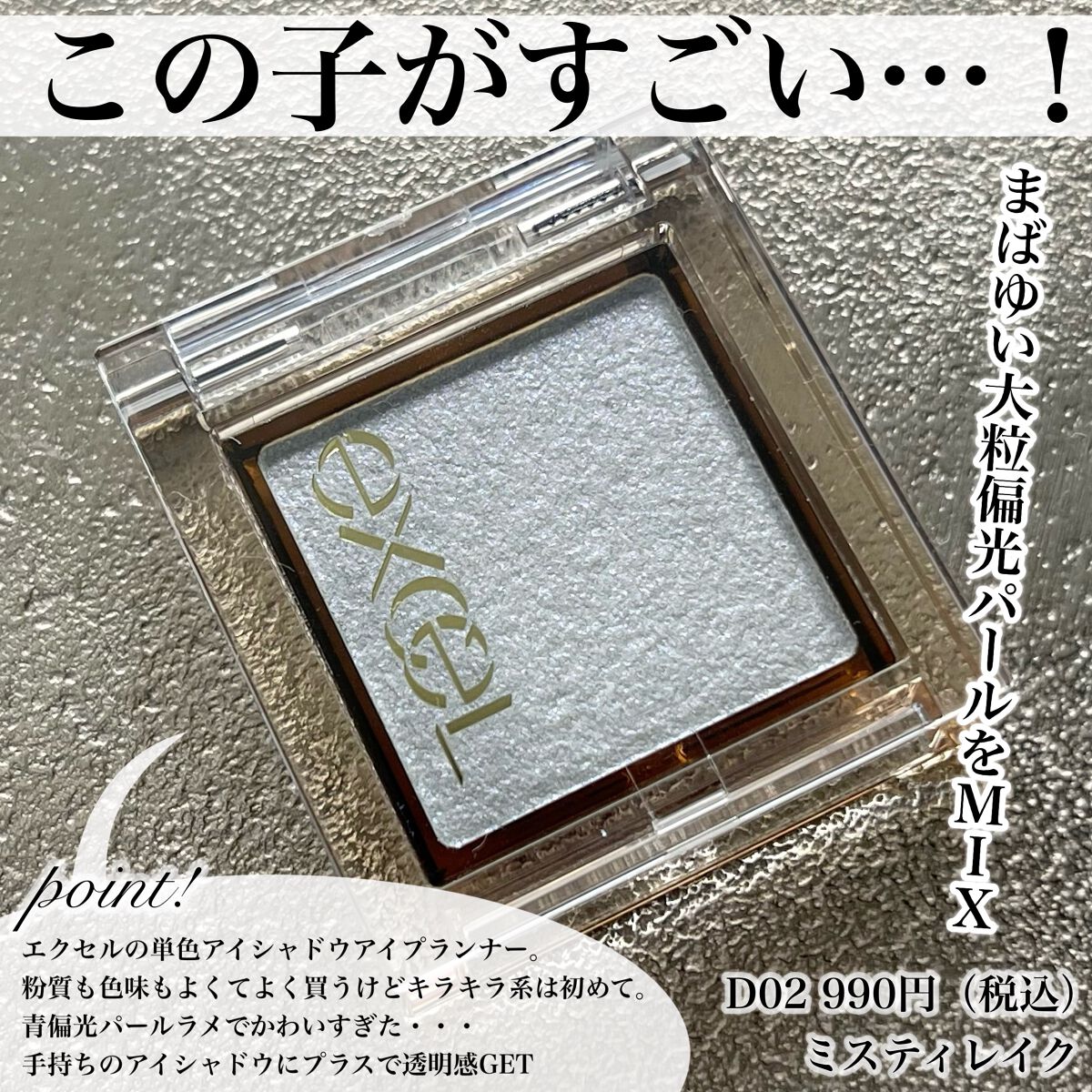 excelアイプランナーD02ミスティレイク¥990D02はDAZZLEタイプ 大粒偏光パール入りで透明感のある 神秘的な輝きのアイスブルー程よい発色で華やかだけどさりげないラメで上品に夏にぴったりの爽やかなカラー手持ちのアイシャドウにプラス...