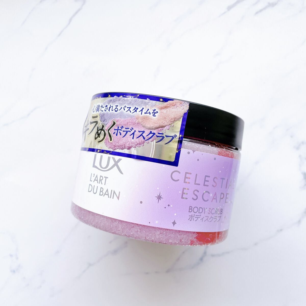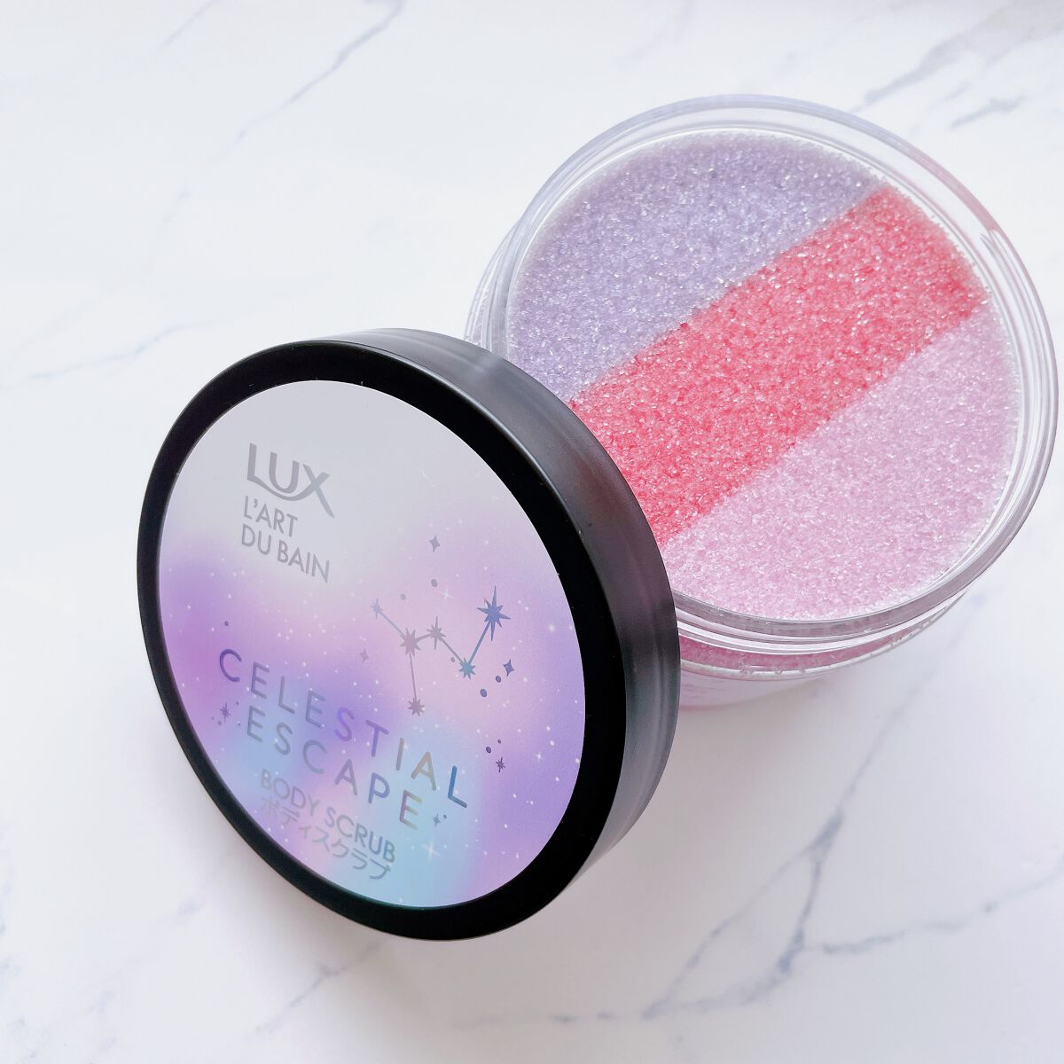 LUXセレスティアルエスケープボディスクラブずっと前に気になっててたまたまアウトレットで見かけたので買ってみた🌟見た目がキラキラしてて可愛い✨スクラブは硬めで、取ると結構ジャリジャリするくらい粗め!香りは甘ったるくて好き嫌い分かれる!でも使用...