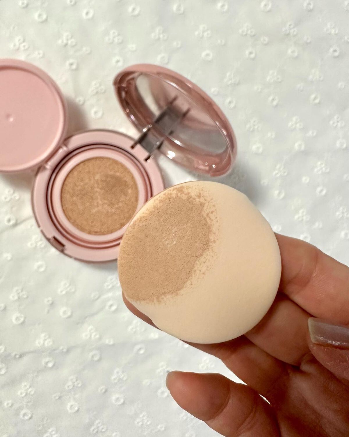 こちらのすごいところは、重ねる回数でカバー力のコントロールが自由自在。 なうえに、回数によって複数の既存品の仕上がりになるそうなんです🫢 しっとりな使い心地で、重ねても厚塗り感も出ないと思います🙊 私はツヤと透明感のある仕上がりが好きなので、普段はささっと1.2回✨ シミや色ムラなどが気になるところは重ねています。 脂性やマットが好きな方はもちろん、ツヤ肌に見せたい場合にも、パウダーと相性も良いんだって。 私は電車等ではマスクもしているので、パウダーと合わせることも多いです🩶 初回は、メッシュ網全体にファンデーションがつかるように軽く押してから💡 ジュエリーケースのような美しいケースも、持っているだけでエレガントになれる気がします💎