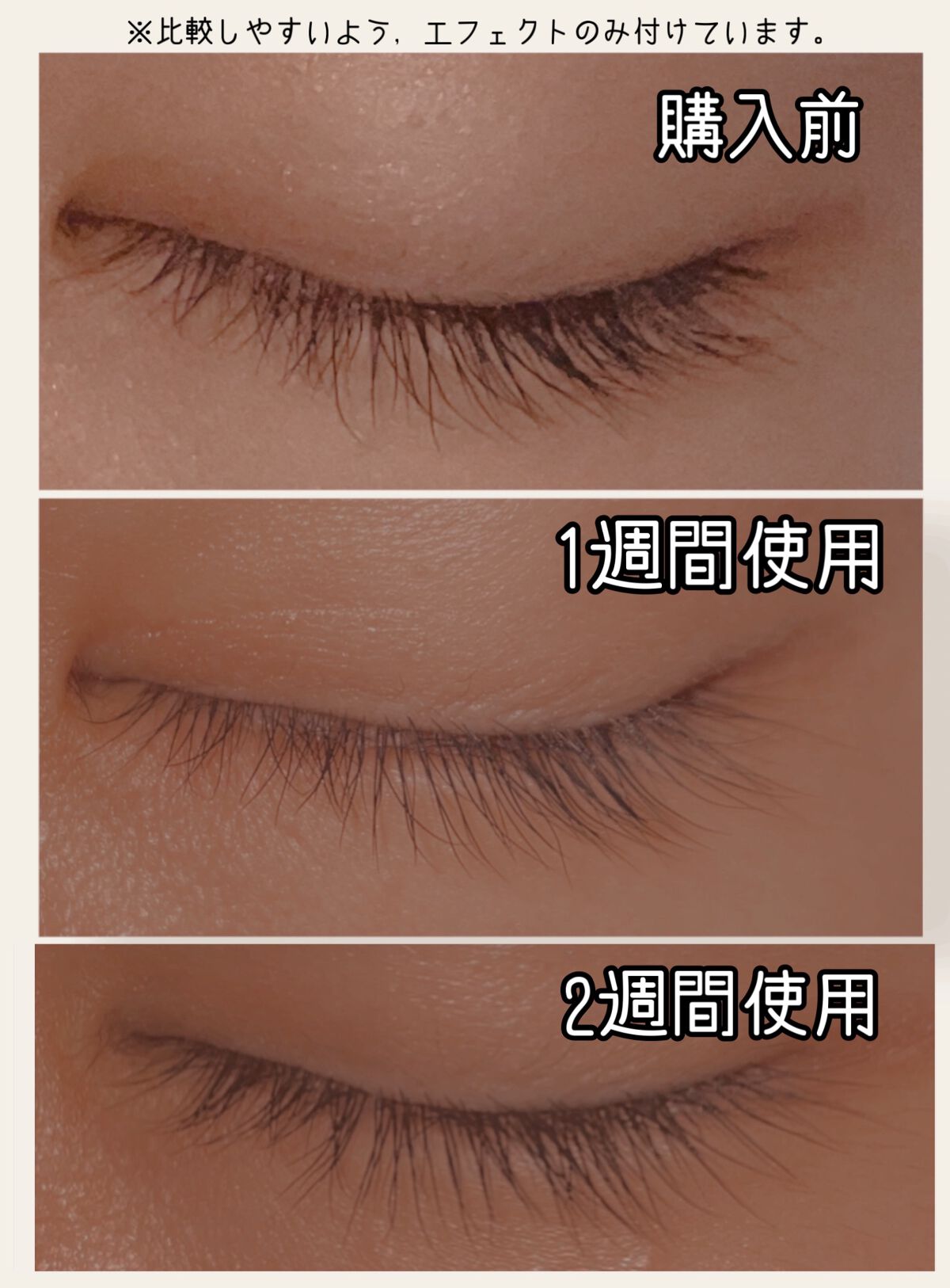 私は敏感肌なのですが肌に優しく、肌荒れも痒みも全くありませんでした!! 3枚目の写真から分かるように目尻のまつ毛が最も伸びました。 毎朝鏡で確認をしていましたが、3日に1度程度でまつ毛の成長を感じられました🥰 何度か塗って伸ばしたいという人には個人的にオススメしません。🧐