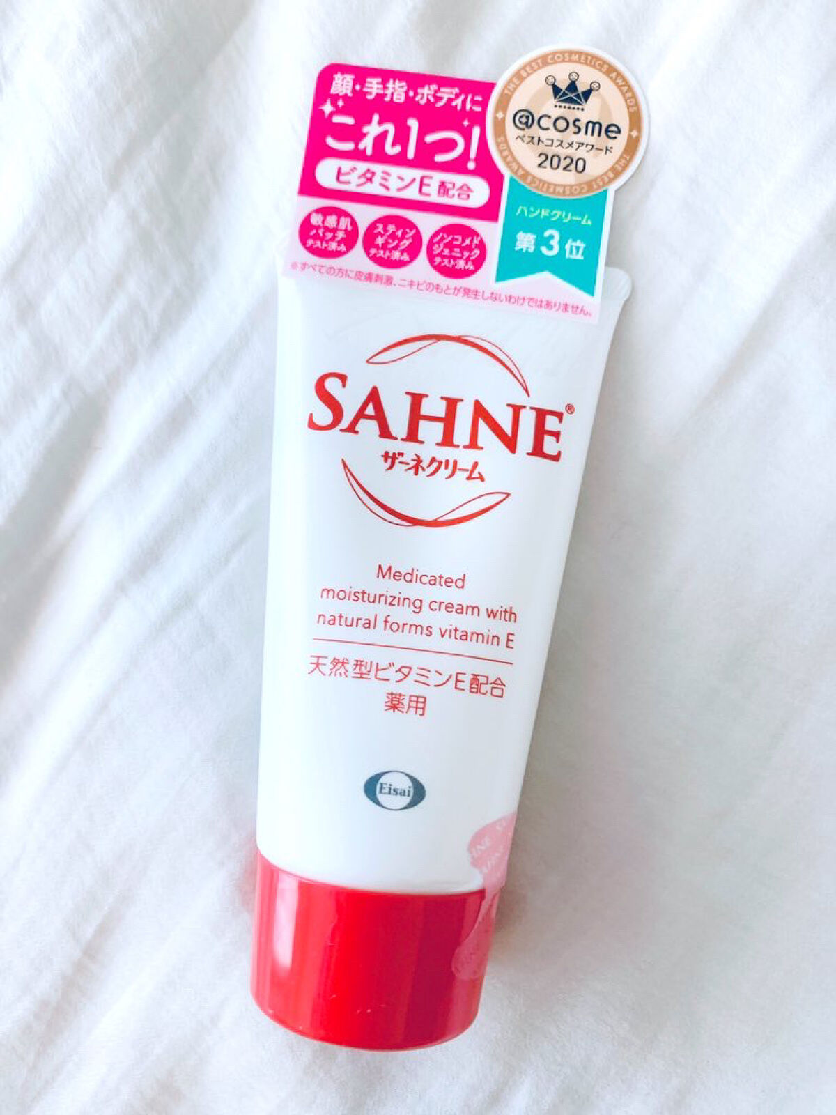 - 【医薬部外品】 おやすみ前の“ビタミンE塗り”で顔も手指もしっとりなめらかに 「ザーネクリーム」で「めぐらせ保湿」。天然型ビタミンEのチカラで肌の血行を促進し、必要な栄養素を届け、ターンオーバーを整えることで、肌をすこやかに保ちます。 しっとりが続くのにベタつかないテクスチャー。肌の刺激にも配慮 製薬会社として外用剤や皮膚生理機能の研究で培ってきた知見をベースに、肌への効果とテクスチャーの両立を追求。 クリーム基剤のノウハウを活かした処方技術により、しっとりが続くのにベタつきません。 塗ってすぐPC・スマートフォン操作や家事もOKです。 また、人の肌の構成成分や、体温で融けやすい融点をもつ成分など、肌との親和性の高い成分を配合し、肌の刺激にも配慮した処方設計です。 香りもマイルドなので、シーンを選ばずお使いいただけます。 有効成分 :天然型ビタミンE、グリチルリチン酸二カリウム(消炎成分) 効能・効果 :肌あれ、あれ性、皮フの乾燥を防ぐ、皮フを保護する、日やけ・雪やけ後のほてり、しもやけ・ひび・ あかぎれ・にきびを防ぐ、かみそり負けを防ぐ、皮フにうるおいを与える、肌を整える、皮フをすこやかに保つ