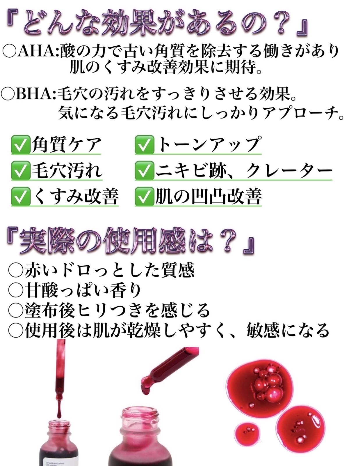 - <AHA 30% + BHA 2% Peeling Solution> グリコール酸、アクア(水)、アロエバルバデンシス葉水、水酸化ナトリウム、Daucus Carota Sativa抽出物、プロパンジオール、コカミドプロピルジメチルアミン、サリチル酸、乳酸、酒石酸、クエン酸、パンテノール、ヒアルロン酸ナトリウムクロスポリマー、タスマンニアランセオラタフルーツ/葉抽出物、グリセリン、ペンチレングリコール、キサンタンガム、ポリソルベート20、エチレンジアミン二コハク酸三ナトリウム、硫酸カリウム、安息香酸ナトリウム、エチルヘキシルグリセリン、1,2-ヘキサンジオール、カプリリルグリコール
