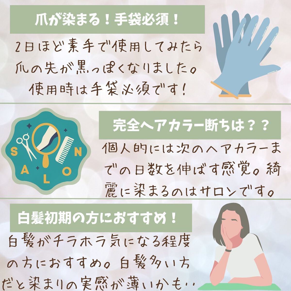 1本8役とは、シャンプー、コンディショナー、トリートメント、ヘアパック、頭皮ケア、白髪染め*1、ダメージケア、ヘッドスパ! 白髪染め*1をしながら、年齢による髪ダメージや頭皮ケアまで1本で行えるというシャンプーです。 仕上がりはサラサラ🌬️ 腰まであるロングヘアですが、毛先まで手触りの良い髪をめざせそう😊