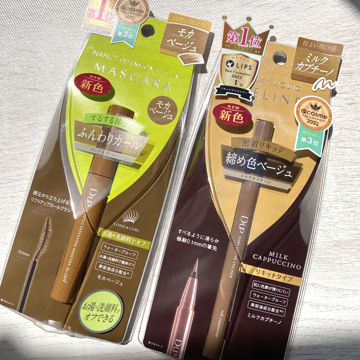 パーフェクトエクステンションマスカラ for カール マスカラ新色 『モカベージュ』 小さめブラシで小回り◎+カールブラシが目のカーブにフィットして塗りやすい🥰 シルキーリキッドアイライナー アイライナー新色 『ミルクカプチーノ』 目尻までかすれず滑らかに理想のラインが描けて、長時間キープ😘 王道ブラウンよりも、柔らかな存在感 やわらかい雰囲気を作りたいときはこれ😍