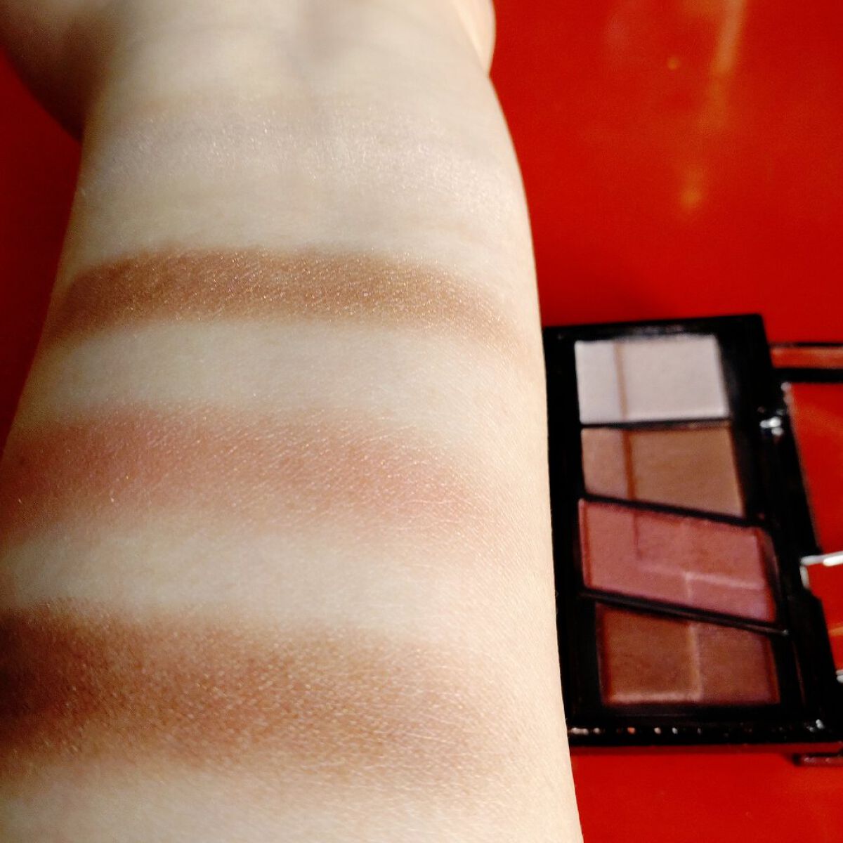 プチプラのクオリティじゃないっ!! 発売前からチェックしていたけれど、ここまで可愛いとは…😆 絶妙カラーで目もとのくすみを飛ばして*明るい印象に🩷 横割りグラデーションでメイクし、立体感をより出したかったので最後に1番左のカラーを上まぶたの真ん中と涙袋にのせています🙆 肌馴染みも良くて粉飛びも感じにくかったです💕 ブラウンの方も店頭に出てたら買おうかな💓