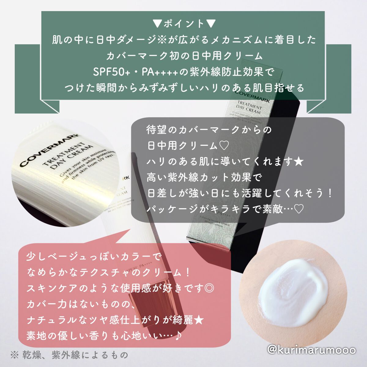 \一軍のデイクリーム☀️/COVERMARKトリートメントデイクリーム8,800円(税込)【使用感】こっくりした使い心地だけど伸びが良くて使いやすい!色つきでは無いので白浮きせずに使える🌷香りもフローラル系の香りで朝のスキンケアの最後にテンシ...