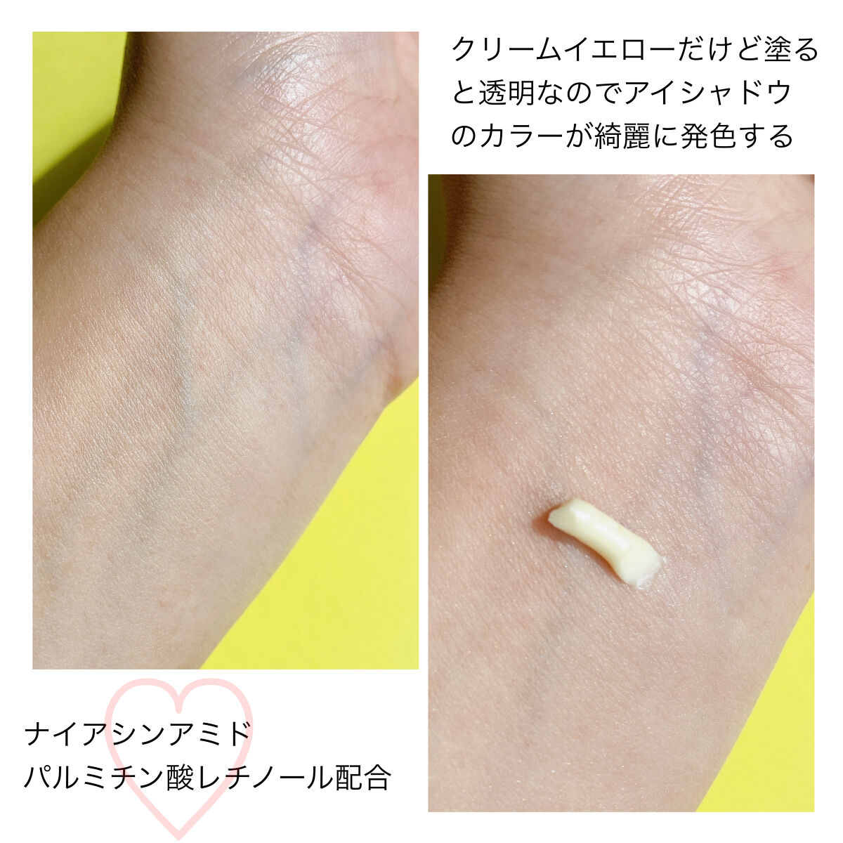 アイシャドウ・アイブロウ・アイライナー マルチに使えるアイメイク下地\♡/ こちらのクリームイエローは、5種の整肌成分配合✨ ・ナイアシンアミド ・パルミチン酸レチノール ・3種のアミノ酸 ・ツボクサ葉エキス ・3種のセラミド 多いとヨレやすいので、少量で大丈夫です🙆♀️