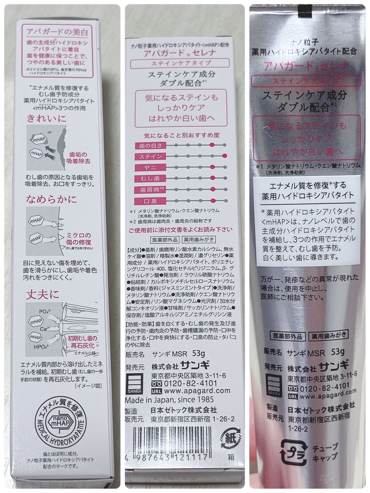 - 【医薬部外品】 美白歯みがき「アパガード」シリーズのステインケアタイプ。サンギ開発のむし歯予防成分「薬用ハイドロキシアパタイト」を配合。歯とほぼ同じ成分(歯のエナメル質の97%はハイドロキシアパタイト)で、エナメル質にアプローチ! さらにステインケア成分をダブル配合*し、コーヒーや紅茶・ワインなどの気になる着色汚れを落とします。 ステインケアではれやか白い歯に。 *メタリン酸ナトリウム(洗浄剤)・クエン酸ナトリウム(洗浄助剤) ●医薬部外品/薬用歯みがき 販売名:サンギMSR