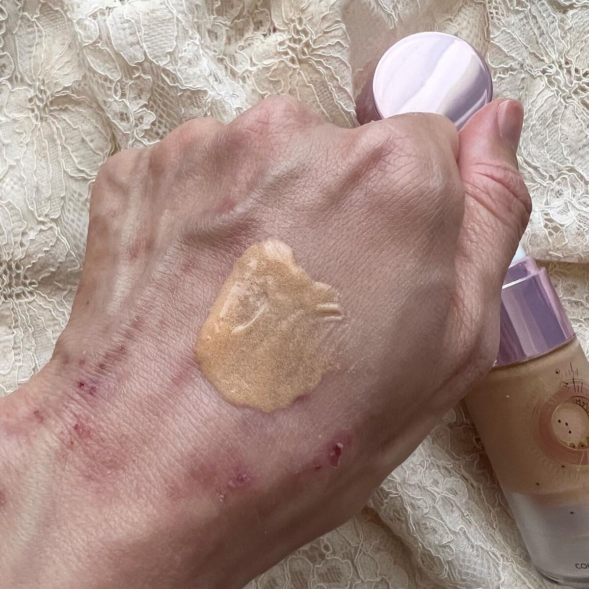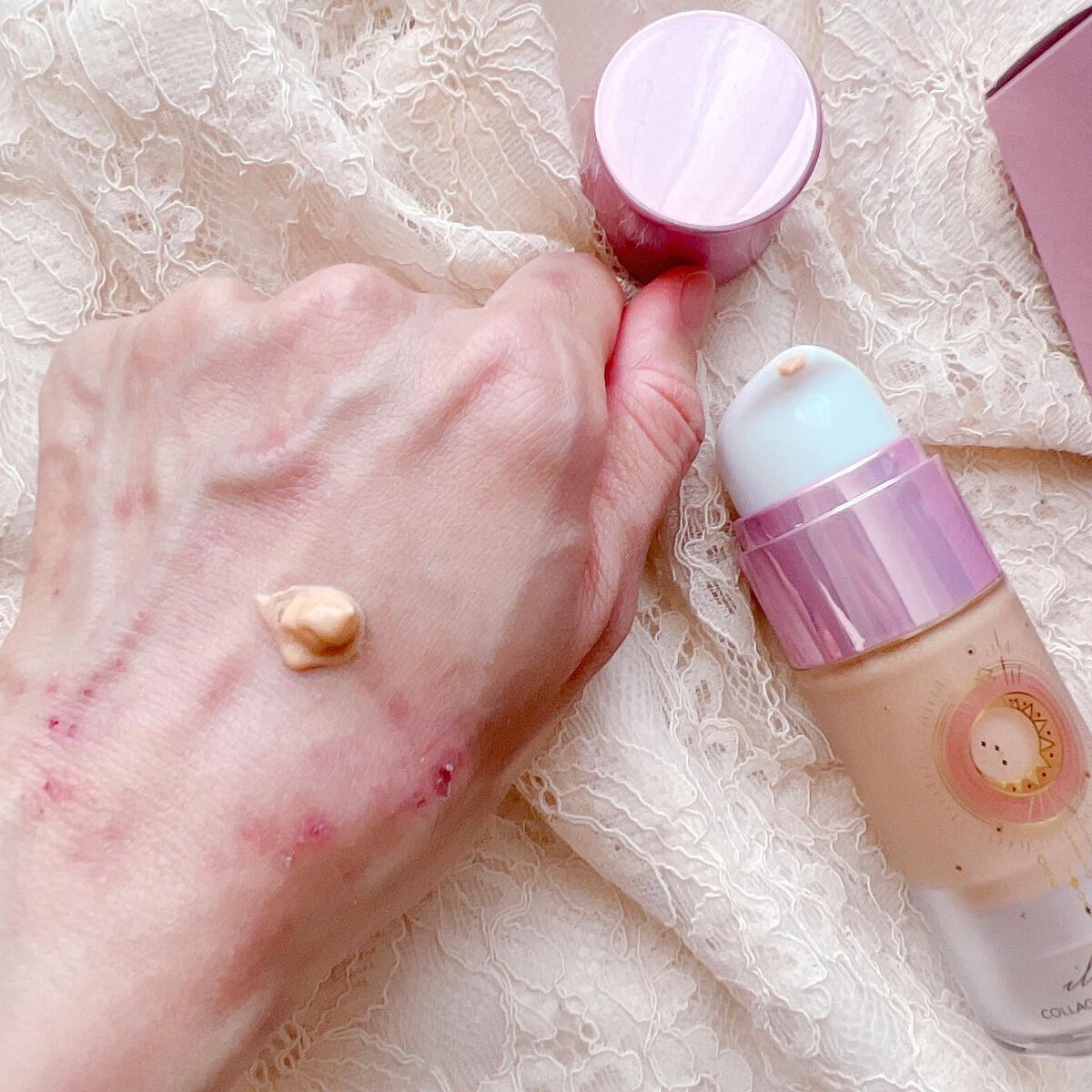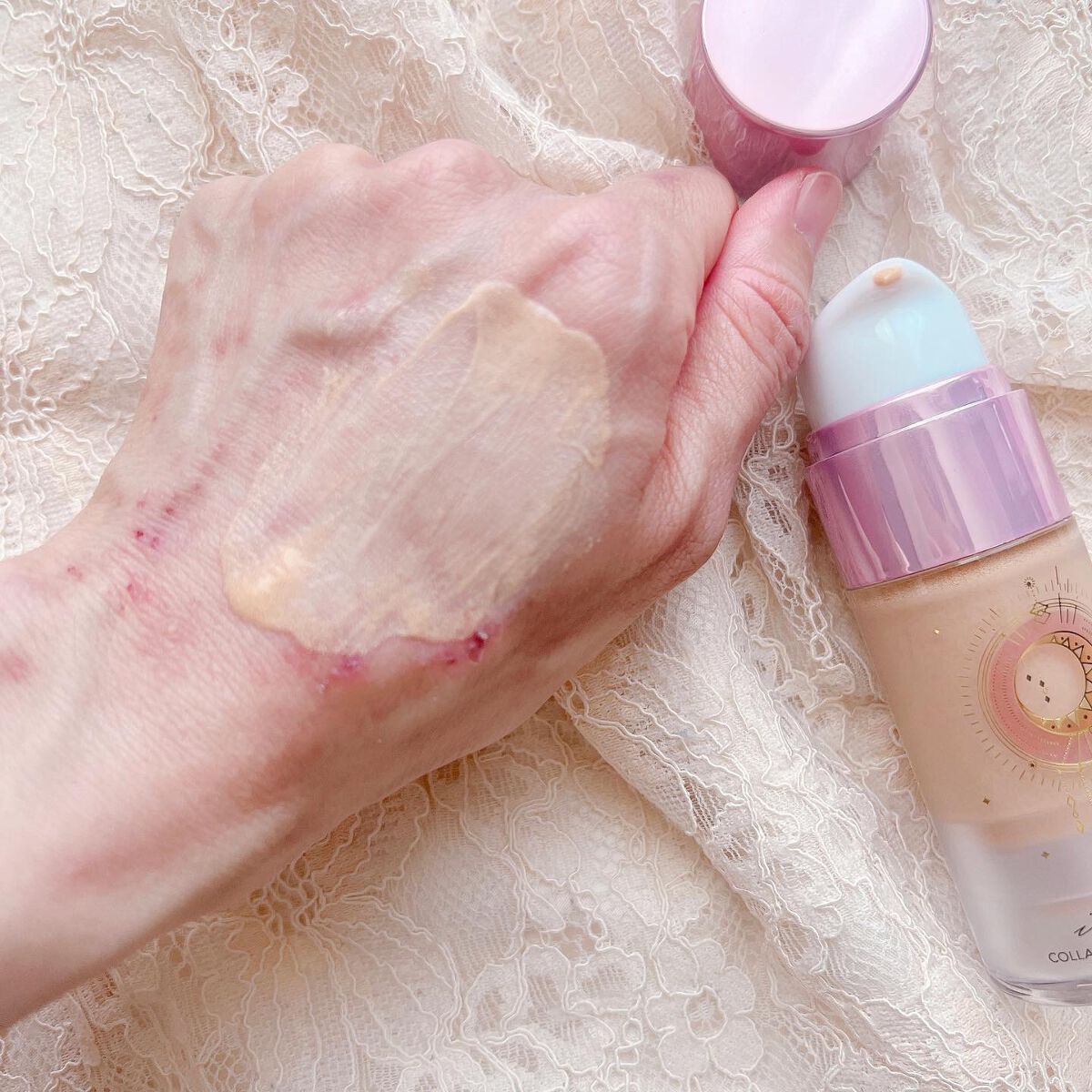 - 水、BG、エチルヘキサン酸セテアリル、酸化チタン、1,2-ヘキサンジオール、パンテノール、水添野菜油、ベヘニルアルコール、タルク、セテアリルアルコール、ステアリン酸、(ジメチコン/ビニルジメチコン)クロスポリマー、カルボマー、トロメタミン、アラントイン、キサンタンガム、エチルヘキシルグリセリン、ポリアクリレートクロスポリマー-6、パントラクトン、ヒマワリ種子油、グリセリン、t-ブタノール、加水分解コラーゲン、シロバナルーピン種子エキス、マコンブエキス、アロエベラ葉エキス、スミレ花エキス、ヤマノイモ根エキス、ウルムスダビディアナ根エキス、トコフェロール、EDTA-2Na、酸化鉄