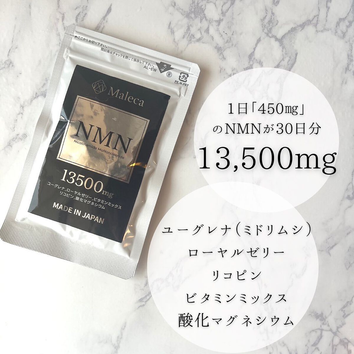 高純度99.9%のβ-NMN20,000㎎配合! NMN(ニコチンアミド・モノヌクレオチド) NMN以外にも、厳選された10種類の美容成分配合! 若々しさがよみがえる ☑︎体力がよみがえる ☑︎肌のキメがアップ ☑︎思考や集中力が高まる ☑︎代謝が上がる 耐酸性カプセル採用で、腸魔で届くから吸収率がいいんだそう。