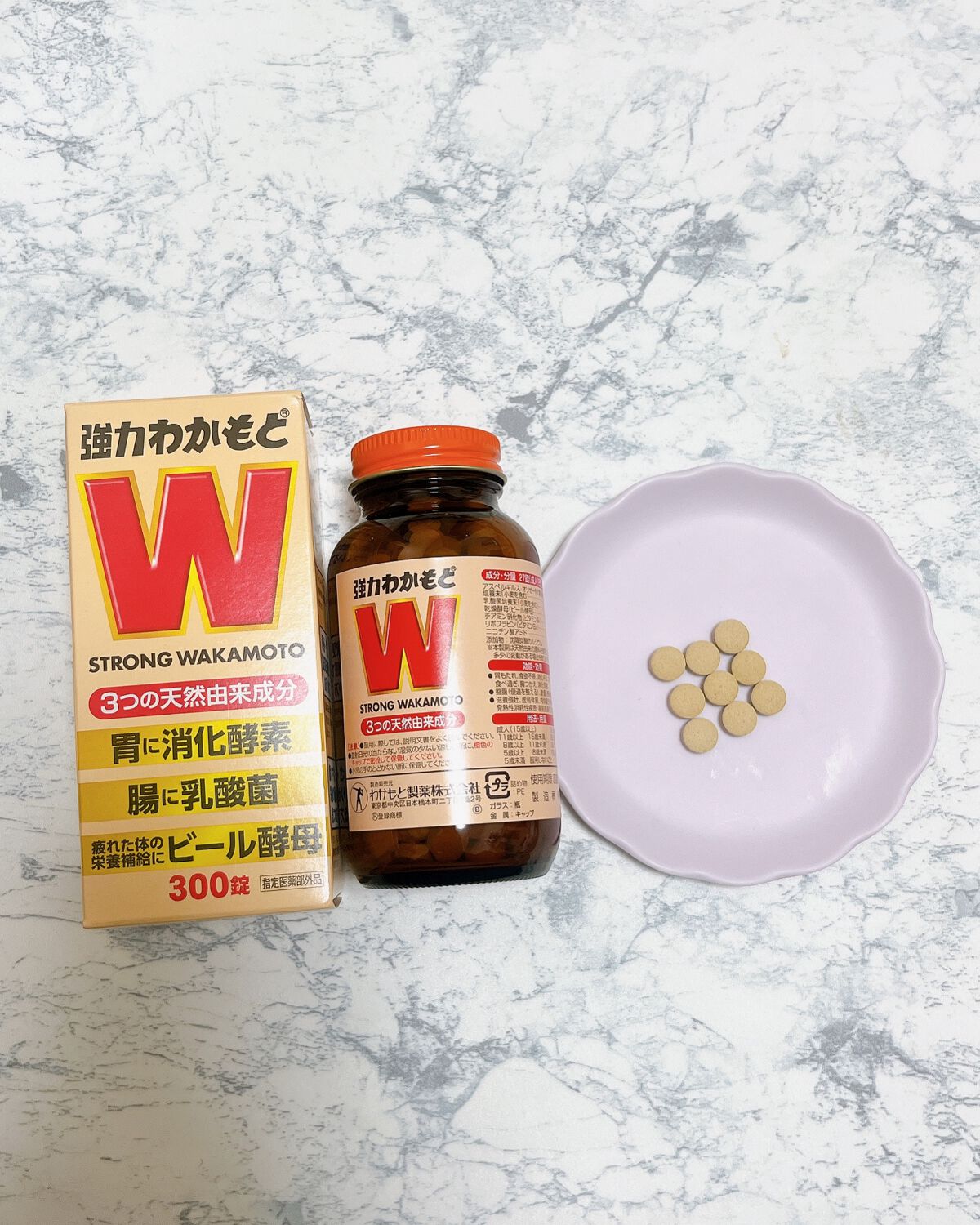 強力わかもと→「強力わかもと」は、消化・整腸・栄養補給の3つの働きを持った胃腸薬。ビール酵母だけではなく、ビタミンB群や麹菌、乳酸菌も入っており、腸活のサポートにもおすすめ☆ →1日3回、食後に9錠ずつ飲みます。薬っぽい苦味はなく、小さめの粒...