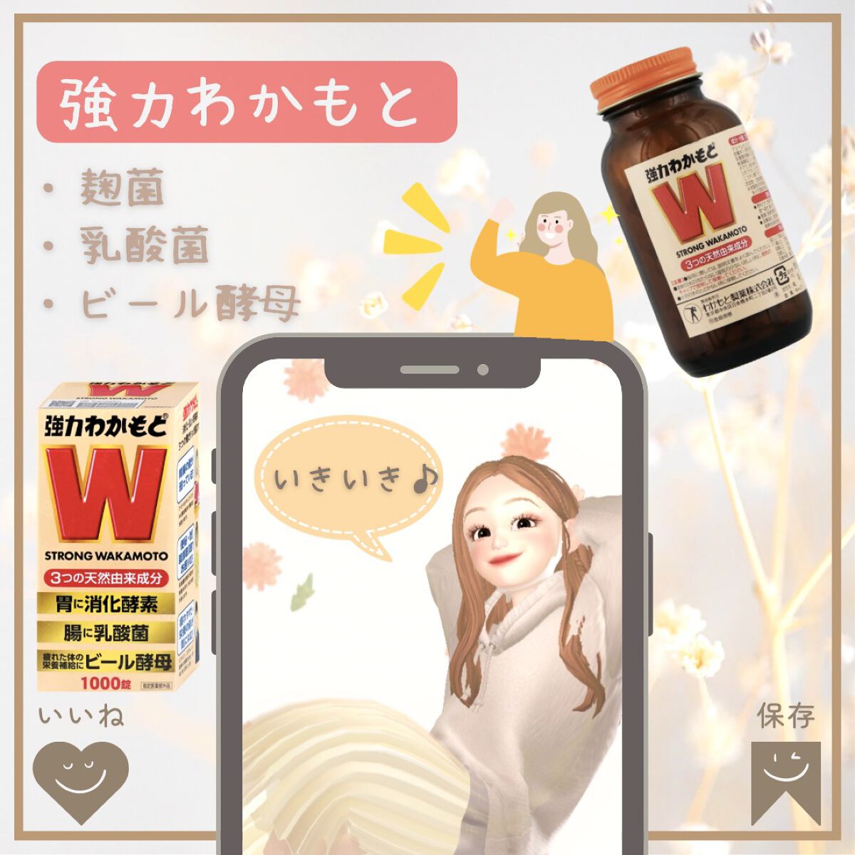 強力わかもと→「強力わかもと」は、消化・整腸・栄養補給の3つの働きを持った胃腸薬。ビール酵母だけではなく、ビタミンB群や麹菌、乳酸菌も入っており、腸活のサポートにもおすすめ☆ →1日3回、食後に9錠ずつ飲みます。薬っぽい苦味はなく、小さめの粒...