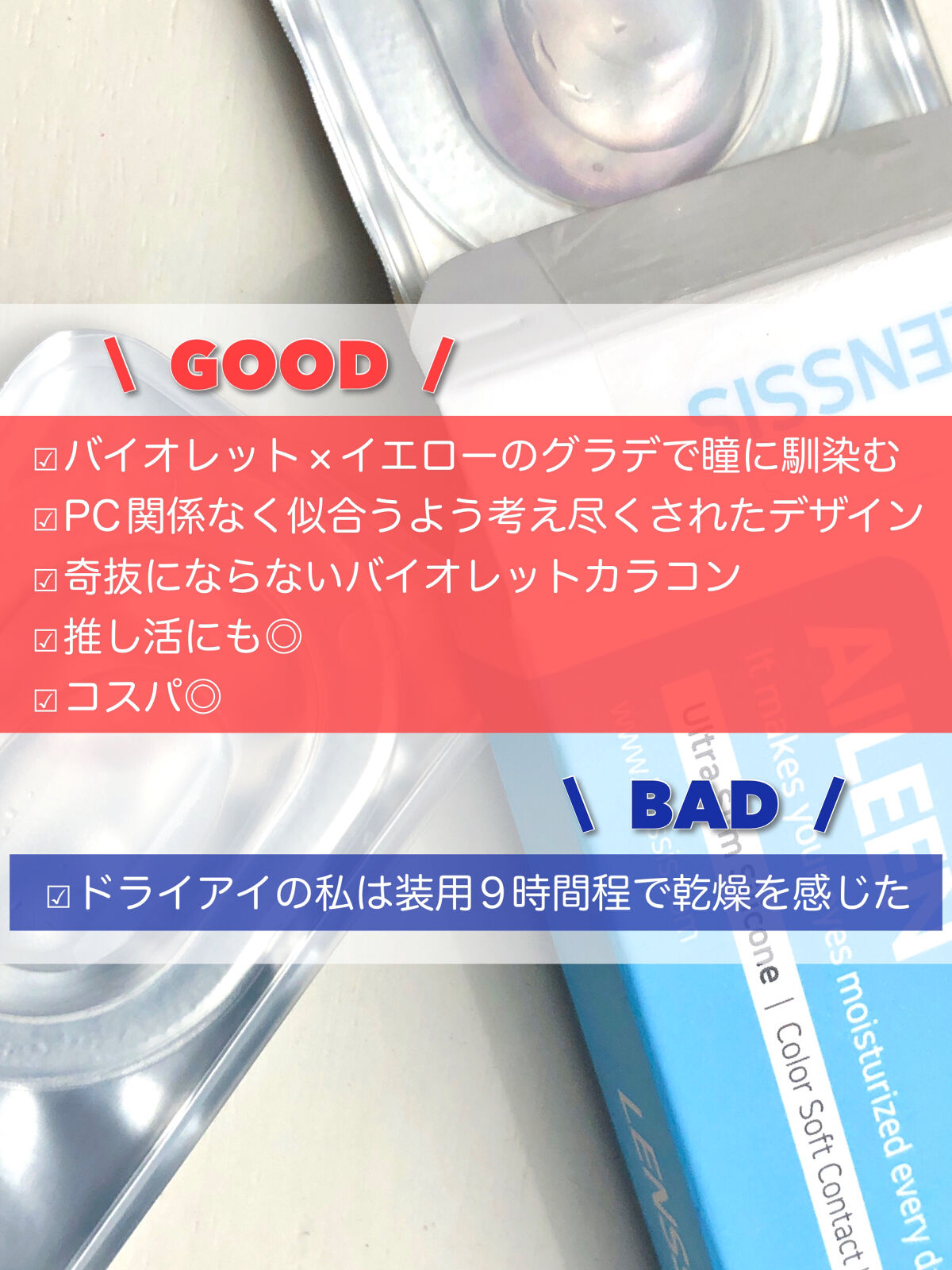 自然なバイオレットカラーの中心にイエローカラーが入ってるから立体感も出るし、パーソナルカラー問わずに使えそう😳❤︎ ナチュラルなバイオレットカラーだから、パープル系カラコン気になるけど…って人、ぜひ使ってみて! このシリーズ初めて使ったけど、 噂通りめちゃくちゃ透明感出る…!!( ; ; ) 黒目のサイズはそのままで、 透明感が爆発しちゃうようなカラコンだよ🫧🤍 だからカラコンに苦手意識がある人にもぜひ使ってみて欲しい🥲🫶