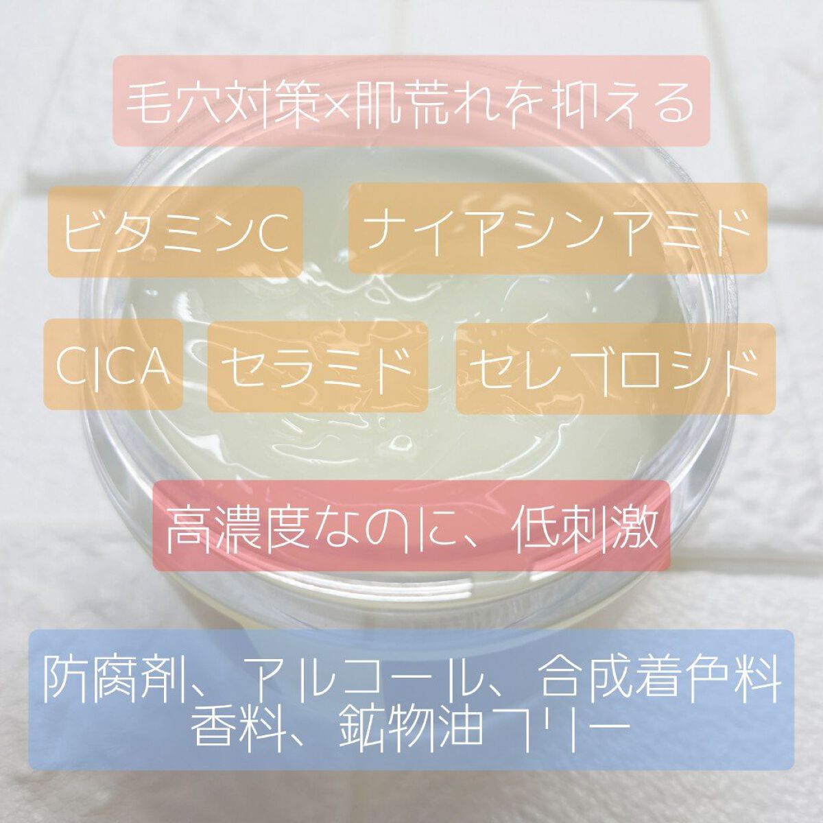 - 毛穴ケアと肌荒れを防ぐジェルクリームが登場。 高濃度*ナイアシンアミド**、4種類のビタミンC**、肌荒れ防止&保湿効果のセラミド**、セレブロシド**、CICA成分(ツボクサエキス**)の合わせ技で、美肌へ集中ケア。なめらかな感触で肌にとろけるようになじみ、肌の角質層からつきあげるようなハリとうるおいを与えます。 肌のことを考え抜いた防腐剤フリー、アルコール(エタノール)フリーです。 *クオリティファーストとして **保湿成分
