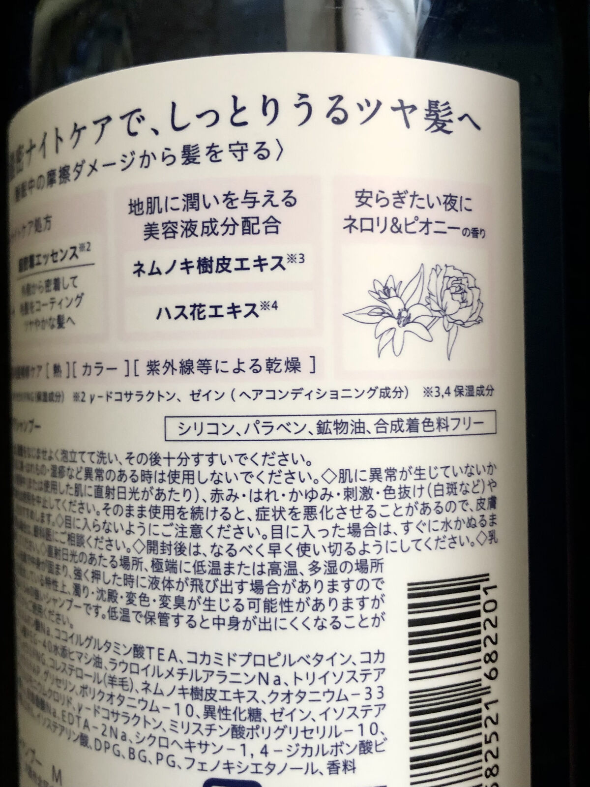 - ダメージリスクは日中だけでなく、夜にも。髪と地肌の濃密ナイトケアで、しっとりうるツヤ髪へ。 ナイトキャップ処方で睡眠中の摩擦・乾燥ダメージから髪を守り、地肌に潤いを与える美容液成分配合。 シャンプー:シリコン、パラベン、鉱物油、合成着色料フリー トリートメント:パラベン、鉱物油、合成着色料フリー ◎ネロリ&ピオニーの香り