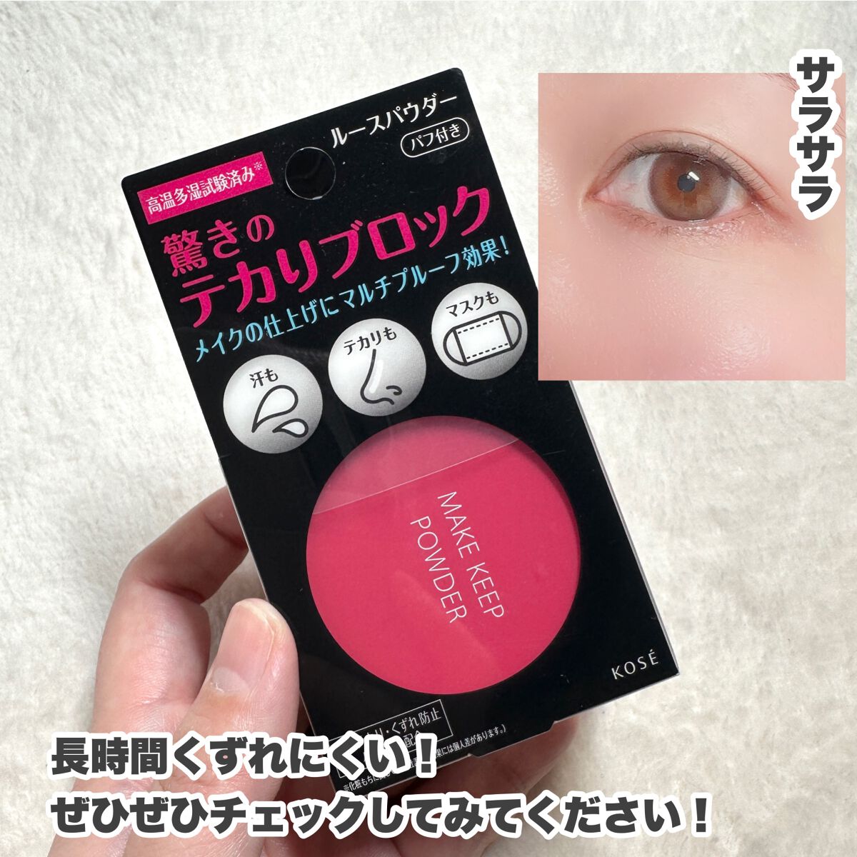 - ● ベースメイクの仕上げにサッとひと塗り! 簡単なのに驚きのキープ力。 ベースメイクの最後にサッとなじませるだけで、サラサラ肌へととのえるフェイスパウダーです。 軽いつけ心地でなじみ、白浮きしにくく、つけたての美しさと毛穴レスな印象のサラサラ肌が長時間持続します。 ● 高いウォータープルーフ&皮脂プルーフ効果! テカリ・ベタつき・化粧くずれを防止。 新たに開発された皮脂テカリ・くずれ防止パウダーで汗や皮脂をはじき、オイルコントロール成分が 皮脂をしっかり吸着。高い皮脂プルーフ効果で、皮脂によるテカリやベタつき、化粧くずれを防ぎます。 ● サラサラな仕上がりが長時間持続! サラサラキープパウダーをたっぷり配合。肌をサラサラにととのえ、キープします。 ● 高温多湿試験済み*1 蒸し暑くてもテカリ・ベタつきを防ぎます。 ● タッチプルーフ成分配合。メイクのマスク移りもしっかり防ぎます! ● セミマットな仕上がりなのに、乾燥を感じにくい。 ● 素肌に直接お使いいただけます。 ● ニキビのもとになりにくい処方 すべてのかたにニキビのもとができないわけではありません。 ● アレルギーテスト済み すべてのかたにアレルギーが起きないというわけではありません。 ● 鉱物油フリー・合成界面活性剤フリー ● 無香料 ● 皮脂テカリ・くずれ防止パウダー*2 ● サラサラキープパウダー ● オイルコントロール成分(皮脂吸着) ● タッチプルーフ成分 *1化粧もちに関して。(コーセー調べ、効果には個人差があります。) *2皮脂テカリ・くずれ防止パウダーはマイカ・トリフルオロアルキルジメチルトリメチルシロキシケイ酸、サラサラキープパウダーはメタクリル酸メチルクロスポリマー、オイルコントロール成分(皮脂吸着)はシリカ、タッチプルーフ成分はタルク・ポリアクリレート‐54です。