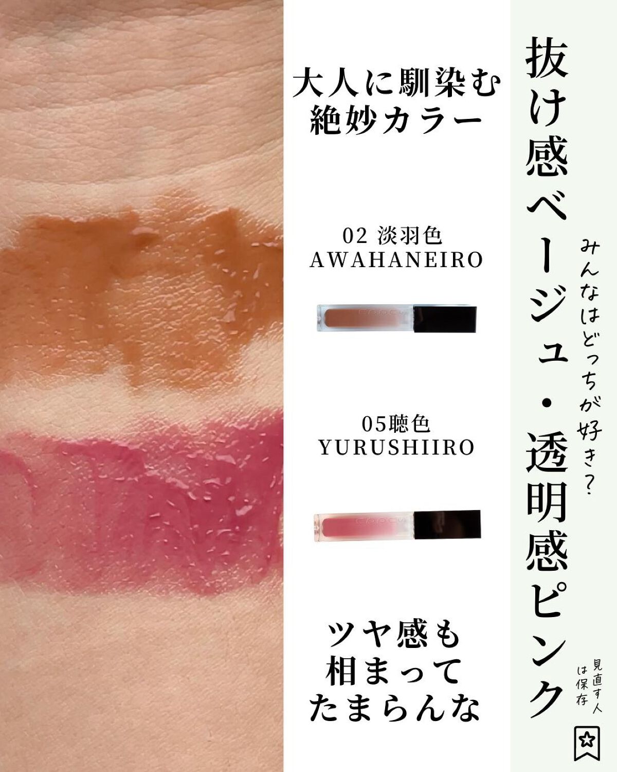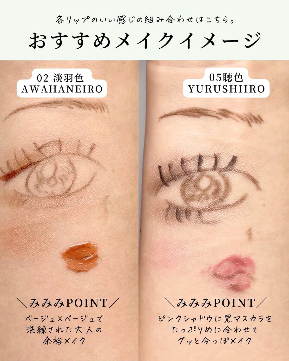 - <01 透桜 -SUKEZAKURA> ミネラルオイル、マイクロクリスタリンワックス、ワセリン、水添ポリイソブテン、リンゴ酸ジイソステアリル、イソノナン酸イソトリデシル、パルミチン酸デキストリン、パラフィン、スクワラン、ラウロイルグルタミン酸ジ(オクチルドデシル/フィトステリル/ベヘニル)、ミリスチン酸オクチルドデシル、パルミトイルヒドロキシプロピルセルロース、トコフェロール、シメチコン、ホホバ種子油、ヒドロキシステアリン酸エチルヘキシル、ジメチコン、クエン酸、ヒアルロン酸Na、フェノキシエタノール、(+/-)(チタン/酸化チタン)焼結物、マイカ、ラウロイルアスパラギン酸Na、ラウロイルリシン、塩化亜鉛、酸化チタン、酸化鉄、水酸化Al、硫酸Ba、トリイソステアリン酸イソプロピルチタン、トリエトキシカプリリルシラン、酸化スズ、ホウケイ酸(Ca/Al)、黄4、青1、赤104(1)、赤201、赤202、赤218、赤223 <02 淡羽色 -AWAHANEIRO> ミネラルオイル、マイクロクリスタリンワックス、ワセリン、水添ポリイソブテン、リンゴ酸ジイソステアリル、イソノナン酸イソトリデシル、パルミチン酸デキストリン、パラフィン、スクワラン、ラウロイルグルタミン酸ジ(オクチルドデシル/フィトステリル/ベヘニル)、ミリスチン酸オクチルドデシル、パルミトイルヒドロキシプロピルセルロース、トコフェロール、シメチコン、ホホバ種子油、ヒドロキシステアリン酸エチルヘキシル、ジメチコン、クエン酸、ヒアルロン酸Na、フェノキシエタノール、(+/-)(チタン/酸化チタン)焼結物、マイカ、ラウロイルアスパラギン酸Na、ラウロイルリシン、塩化亜鉛、酸化チタン、酸化鉄、水酸化Al、硫酸Ba、トリイソステアリン酸イソプロピルチタン、トリエトキシカプリリルシラン、酸化スズ、ホウケイ酸(Ca/Al)、黄4、青1、赤104(1)、赤201、赤202、赤218、赤223 <03 蜜込 -MITSUKOME> ミネラルオイル、マイクロクリスタリンワックス、ワセリン、水添ポリイソブテン、リンゴ酸ジイソステアリル、イソノナン酸イソトリデシル、パルミチン酸デキストリン、パラフィン、スクワラン、ラウロイルグルタミン酸ジ(オクチルドデシル/フィトステリル/ベヘニル)、ミリスチン酸オクチルドデシル、パルミトイルヒドロキシプロピルセルロース、トコフェロール、シメチコン、ホホバ種子油、ヒドロキシステアリン酸エチルヘキシル、ジメチコン、クエン酸、ヒアルロン酸Na、フェノキシエタノール、(+/-)(チタン/酸化チタン)焼結物、マイカ、ラウロイルアスパラギン酸Na、ラウロイルリシン、塩化亜鉛、酸化チタン、酸化鉄、水酸化Al、硫酸Ba、トリイソステアリン酸イソプロピルチタン、トリエトキシカプリリルシラン、酸化スズ、ホウケイ酸(Ca/Al)、黄4、青1、赤104(1)、赤201、赤202、赤218、赤223 <04 艶煉瓦 -TSUYARENGA> ミネラルオイル、マイクロクリスタリンワックス、ワセリン、水添ポリイソブテン、リンゴ酸ジイソステアリル、イソノナン酸イソトリデシル、パルミチン酸デキストリン、パラフィン、スクワラン、ラウロイルグルタミン酸ジ(オクチルドデシル/フィトステリル/ベヘニル)、ミリスチン酸オクチルドデシル、パルミトイルヒドロキシプロピルセルロース、トコフェロール、シメチコン、ホホバ種子油、ヒドロキシステアリン酸エチルヘキシル、ジメチコン、クエン酸、ヒアルロン酸Na、フェノキシエタノール、(+/-)(チタン/酸化チタン)焼結物、マイカ、ラウロイルアスパラギン酸Na、ラウロイルリシン、塩化亜鉛、酸化チタン、酸化鉄、水酸化Al、硫酸Ba、トリイソステアリン酸イソプロピルチタン、トリエトキシカプリリルシラン、酸化スズ、ホウケイ酸(Ca/Al)、黄4、青1、赤104(1)、赤201、赤202、赤218、赤223 <05 聴色 -YURUSHIIRO> ミネラルオイル、マイクロクリスタリンワックス、ワセリン、水添ポリイソブテン、リンゴ酸ジイソステアリル、イソノナン酸イソトリデシル、パルミチン酸デキストリン、パラフィン、スクワラン、ラウロイルグルタミン酸ジ(オクチルドデシル/フィトステリル/ベヘニル)、ミリスチン酸オクチルドデシル、パルミトイルヒドロキシプロピルセルロース、トコフェロール、シメチコン、ホホバ種子油、ヒドロキシステアリン酸エチルヘキシル、ジメチコン、クエン酸、ヒアルロン酸Na、フェノキシエタノール、(+/-)(チタン/酸化チタン)焼結物、マイカ、ラウロイルアスパラギン酸Na、ラウロイルリシン、塩化亜鉛、酸化チタン、酸化鉄、水酸化Al、硫酸Ba、トリイソステアリン酸イソプロピルチタン、トリエトキシカプリリルシラン、酸化スズ、ホウケイ酸(Ca/Al)、黄4、青1、赤104(1)、赤201、赤202、赤218、赤223 <101 白菫 -SHIROSUMIRE(限定色)> ミネラルオイル、マイクロクリスタリンワックス、ワセリン、水添ポリイソブテン、リンゴ酸ジイソステアリル、イソノナン酸イソトリデシル、パルミチン酸デキストリン、パラフィン、スクワラン、ラウロイルグルタミン酸ジ(オクチルドデシル/フィトステリル/ベヘニル)、ミリスチン酸オクチルドデ
