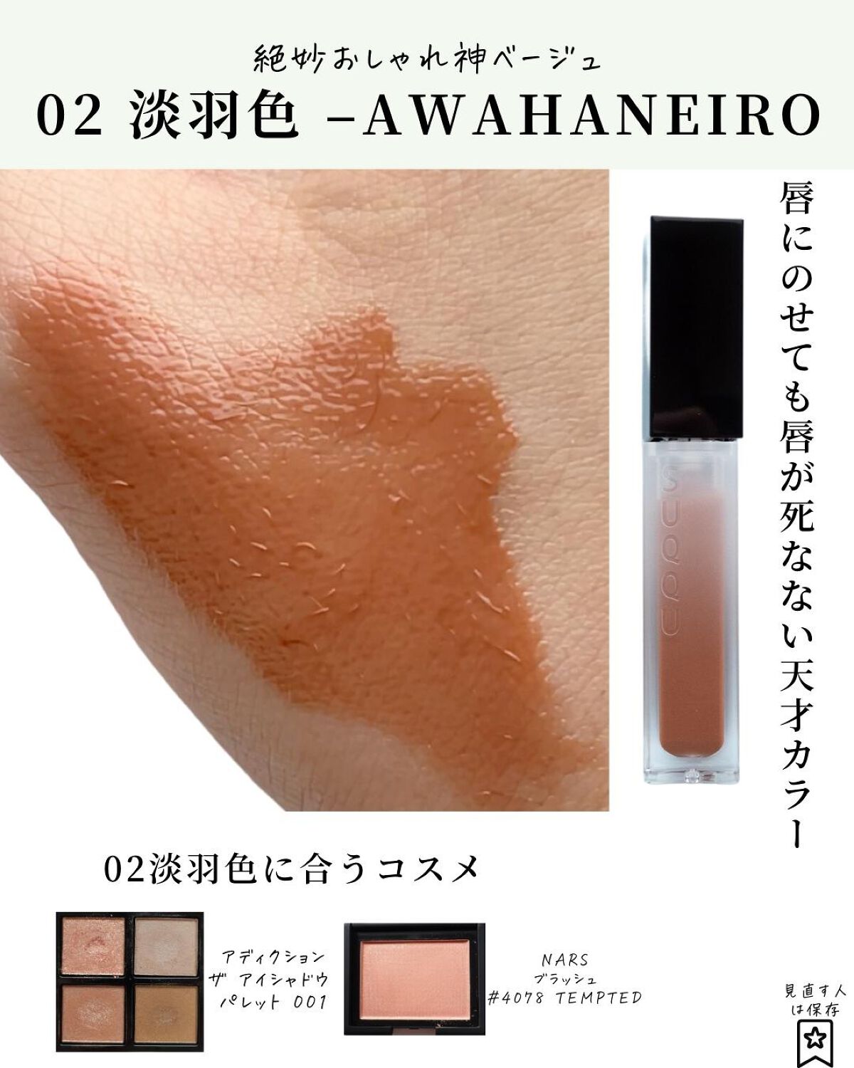 - 素の唇の美しい色艶を叶えながら唇をケア。 ケア効果、色、艶を兼ね備えた新リップ、誕生。 まるで素の唇がきれいであるかのような、血色感とヘルシーな艶感。 唇のうるおいをしっかり閉じ込め、塗っている方が荒れにくい程の美容液効果を発揮。 ケア効果と洗練された色艶を両立するリップが誕生しました。 肌なじみが良く、自然に美しく彩る旬の色味を厳選してラインナップ。 程よい透け感と艶感で、美しい唇を演出します。