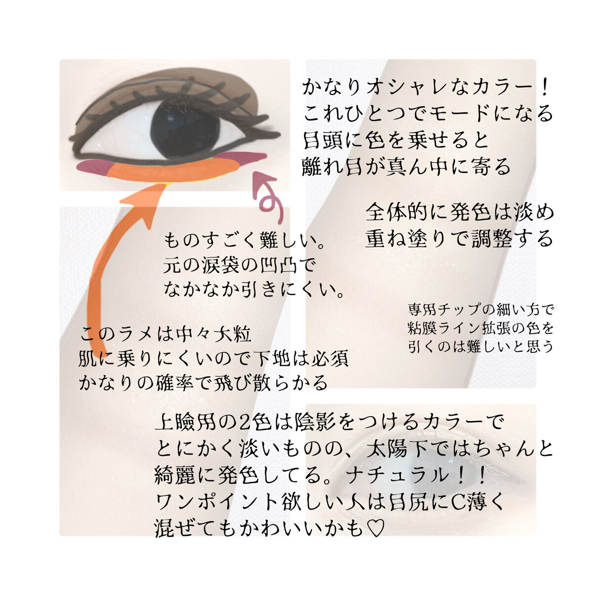 1パレットで下まぶたメイクまで完成するアイシャドウ KATE バーチャルアイズメイカー ¥1,540 下まぶた用のグリッターがキラキラしてすごくかわいいです。 タソガレは大人っぽいけど可愛らしさもあるカラーです。 落ち着いたブラウン系のオレンジでどんな場面でも使いやすいと思います😊