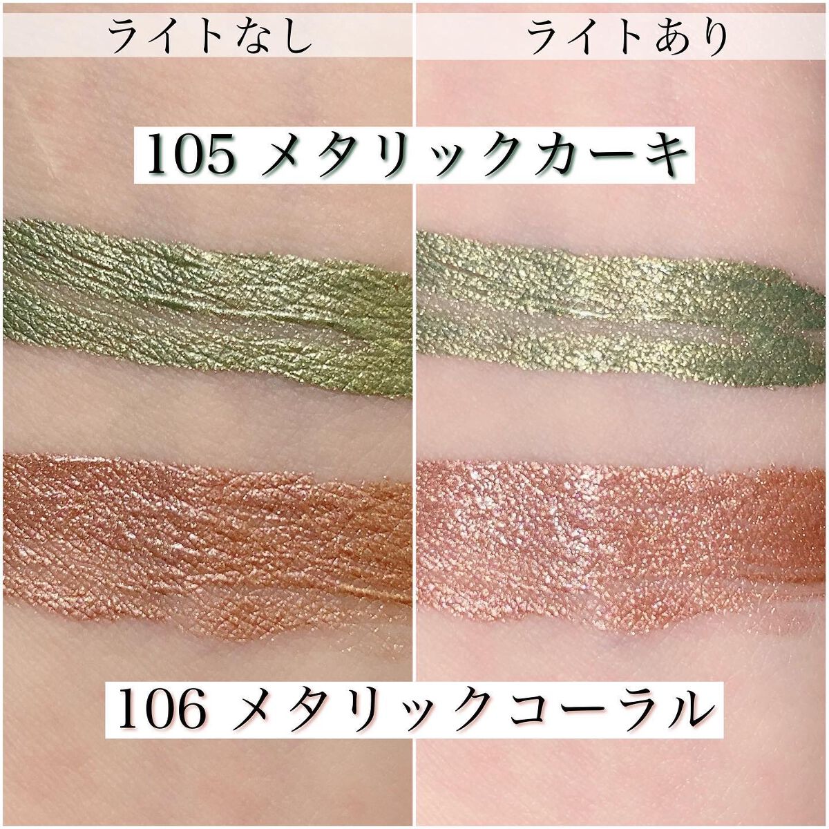 - <101 メタリックブロンズ> 水、(アクリレーツ/アクリル酸エチルヘキシル)コポリマー、BG、ミツロウ、カルナウバロウ、ステアリン酸、シリカ、TEA、PVP、ジフェニルシロキシフェニルトリメチコン、ステアリン酸ソルビタン、パルミチン酸、ワセリン、(HDI/トリメチロールヘキシルラクトン)クロスポリマー、ジメチコン、ポリソルベート60、ミリスチン酸、ラウレス-21、フェノキシエタノール、エチルヘキシルグリセリン、メチルパラベン、ヒドロキシエチルセルロース、トコフェロール、パンテノール、グリセリン、加水分解コラーゲン、PCA-Na、乳酸Na、ヒアルロン酸Na、リンゴ果実培養細胞エキス、アルギニン、アスパラギン酸、PCA、ローズマリー葉エキス、ビワ葉エキス、マグワ根皮エキス、グリシン、アラニン、キサンタンガム、センチフォリアバラ花エキス、ブドウ葉エキス、加水分解コンキオリン、セリン、ノイバラ果実エキス、バリン、イソロイシン、トレオニン、プロリン、ヒスチジン、フェニルアラニン、レシチン、ユズ果実エキス、ビオチノイルトリペプチド-1、酸化鉄、Al、マイカ、タルク <102 メタリックゴールド> 水、(アクリレーツ/アクリル酸エチルヘキシル)コポリマー、BG、ミツロウ、カルナウバロウ、ステアリン酸、シリカ、TEA、PVP、ジフェニルシロキシフェニルトリメチコン、ステアリン酸ソルビタン、パルミチン酸、ワセリン、(HDI/トリメチロールヘキシルラクトン)クロスポリマー、ジメチコン、ポリソルベート60、ミリスチン酸、ラウレス-21、フェノキシエタノール、エチルヘキシルグリセリン、メチルパラベン、ヒドロキシエチルセルロース、トコフェロール、パンテノール、グリセリン、加水分解コラーゲン、PCA-Na、乳酸Na、ヒアルロン酸Na、リンゴ果実培養細胞エキス、アルギニン、アスパラギン酸、PCA、ローズマリー葉エキス、ビワ葉エキス、マグワ根皮エキス、グリシン、アラニン、キサンタンガム、センチフォリアバラ花エキス、ブドウ葉エキス、加水分解コンキオリン、セリン、ノイバラ果実エキス、バリン、イソロイシン、トレオニン、プロリン、ヒスチジン、フェニルアラニン、レシチン、ユズ果実エキス、ビオチノイルトリペプチド-1、Al、マイカ、酸化鉄、タルク、酸化チタン <103 メタリックエメラルド> 水、(アクリレーツ/アクリル酸エチルヘキシル)コポリマー、BG、ミツロウ、カルナウバロウ、ステアリン酸、シリカ、TEA、PVP、ジフェニルシロキシフェニルトリメチコン、ステアリン酸ソルビタン、パルミチン酸、ワセリン、(HDI/トリメチロールヘキシルラクトン)クロスポリマー、ジメチコン、ポリソルベート60、ミリスチン酸、ラウレス-21、フェノキシエタノール、エチルヘキシルグリセリン、メチルパラベン、ヒドロキシエチルセルロース、トコフェロール、パンテノール、グリセリン、加水分解コラーゲン、PCA-Na、乳酸Na、ヒアルロン酸Na、リンゴ果実培養細胞エキス、アルギニン、アスパラギン酸、PCA、ローズマリー葉エキス、ビワ葉エキス、マグワ根皮エキス、グリシン、アラニン、キサンタンガム、センチフォリアバラ花エキス、ブドウ葉エキス、加水分解コンキオリン、セリン、ノイバラ果実エキス、バリン、イソロイシン、トレオニン、プロリン、ヒスチジン、フェニルアラニン、レシチン、ユズ果実エキス、ビオチノイルトリペプチド-1、Al、水酸化クロム、銀、グンジョウ、マイカ、タルク、酸化鉄、酸化スズ <104 メタリックピンク> 水、(アクリレーツ/アクリル酸エチルヘキシル)コポリマー、BG、ミツロウ、カルナウバロウ、ステアリン酸、TEA、PVP、ジフェニルシロキシフェニルトリメチコン、ステアリン酸ソルビタン、パルミチン酸、ワセリン、(HDI/トリメチロールヘキシルラクトン)クロスポリマー、ジメチコン、ポリソルベート60、ミリスチン酸、ラウレス-21、フェノキシエタノール、エチルヘキシルグリセリン、メチルパラベン、ヒドロキシエチルセルロース、トコフェロール、パンテノール、グリセリン、加水分解コラーゲン、PCA-Na、乳酸Na、ヒアルロン酸Na、リンゴ果実培養細胞エキス、アルギニン、アスパラギン酸、PCA、ローズマリー葉エキス、ビワ葉エキス、マグワ根皮エキス、グリシン、アラニン、キサンタンガム、センチフォリアバラ花エキス、ブドウ葉エキス、加水分解コンキオリン、セリン、ノイバラ果実エキス、バリン、イソロイシン、トレオニン、プロリン、ヒスチジン、フェニルアラニン、レシチン、ユズ果実エキス、ビオチノイルトリペプチド-1、合成フルオロフロゴパイト、シリカ、マイカ、タルク、酸化鉄、酸化チタン、AI、銀、水酸化AI、グンジョウ、赤226、酸化スズ <201 ブルージュブラック> 水、(アクリレーツ/アクリル酸エチルヘキシル)コポリマー、BG、ミツロウ、カルナウバロウ、ステアリン酸、TEA、PVP、ジフェニルシロキシフェニルトリメチコン、ステアリン酸ソルビタン、パルミチン酸、ワセリン、(HDI/トリメチロールヘキ